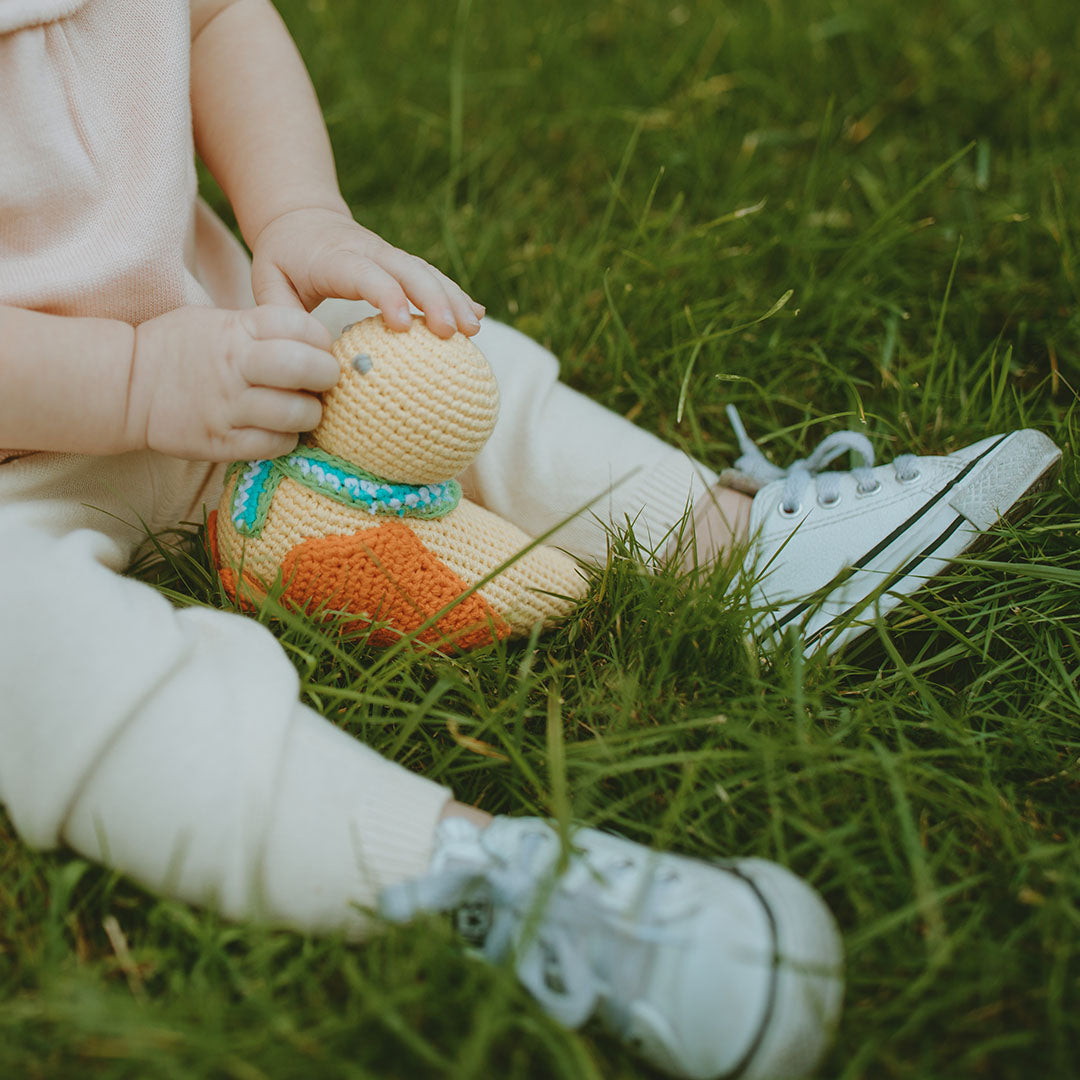 With her dapper green scarf and little orange feet, this baby duck toy is ready for an adventure! Crocheted with buttery soft cotton yarn, this handmade stuffed duck is as sweet as can be. Just the right size for little hands to grab and cuddle. The rattle inside gives a very soft sound when shaken. Adds a pop of color to Easter baskets. A much-loved favorite baby toy.