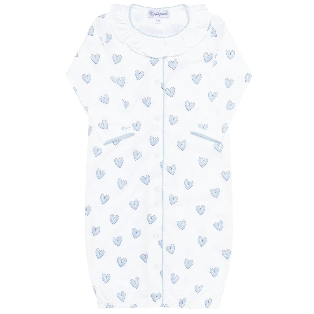 Our Blue Heart Print Converter Gown features a picot trim detail around the collar, cuff and down the snap-close front in a classic soft blue color, and is printed all over with heart shaped designs. Made of 100% Pima cotton, this gown is stretchy and feels soft on your baby's skin.