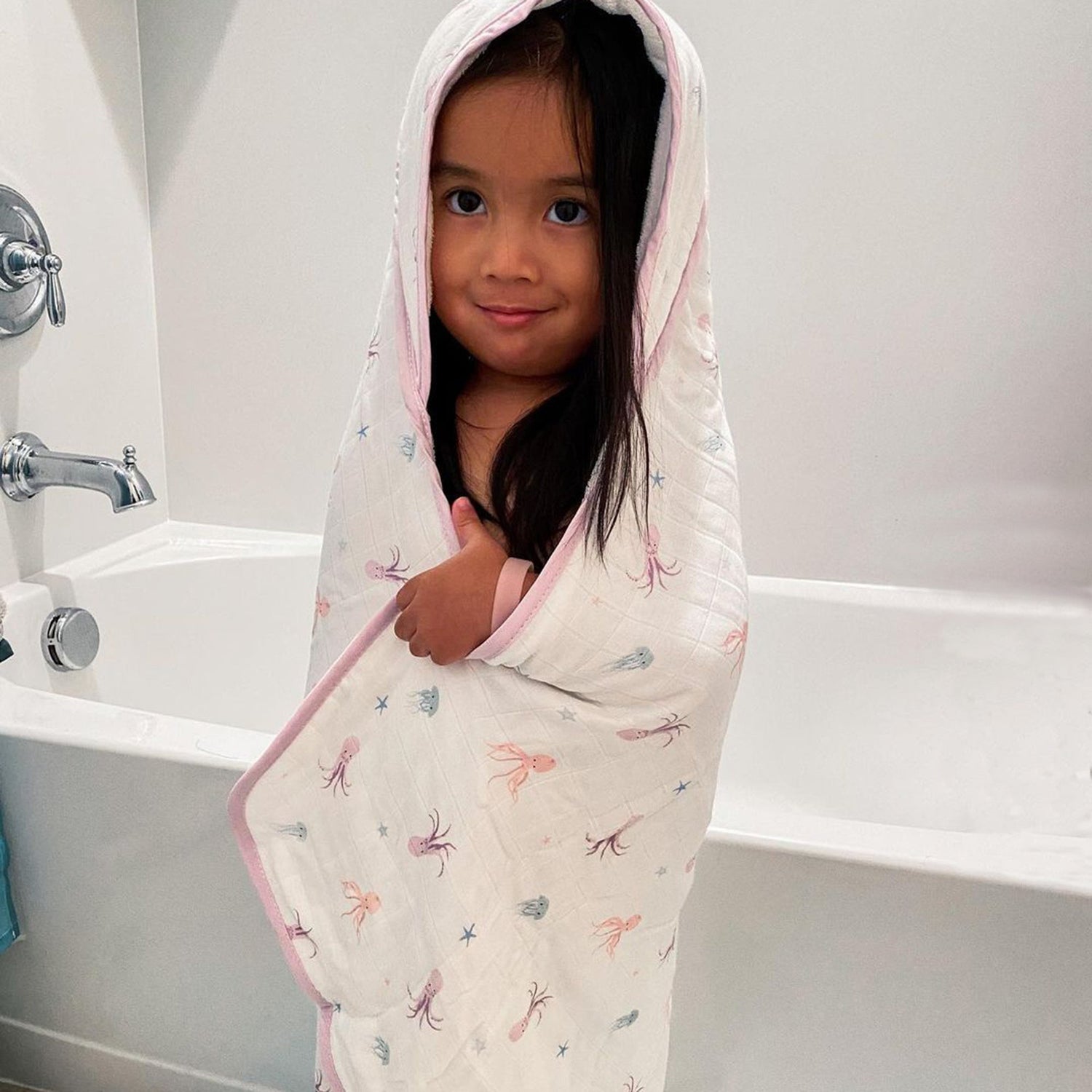 Bamboo Little's matching hooded towel and washcloth sets make bath time a joy. Each towel and washcloth features an ultra-absorbent and super-soft terry backing. The generously sized towels are perfect for babies with sensitive skin, offering natural moisture-wicking and odor-resistant properties, ensuring smiles long after the splashes are over.