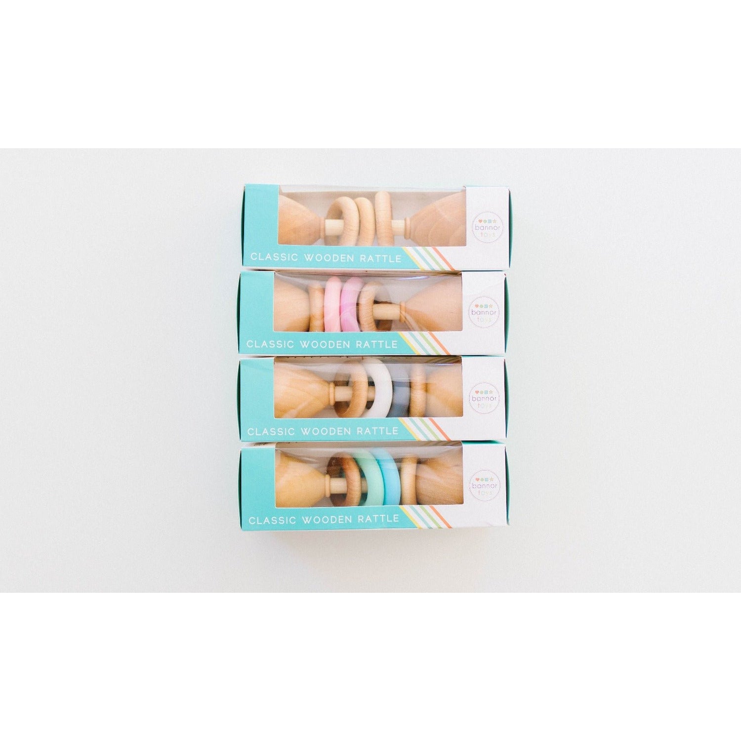 If you think our Classic Baby Rattle is amazing, you will love this colorful spin on it! This beautiful baby rattle is finished with a natural beeswax/flaxseed oil finish and includes food grade silicone rings for a pop of color and textures to capture your babes attention. It is smooth, safe for babies, and makes a fun noise. As your baby plays, they develop their senses of touch, sight, and sound. Makes a fun and personal gift.