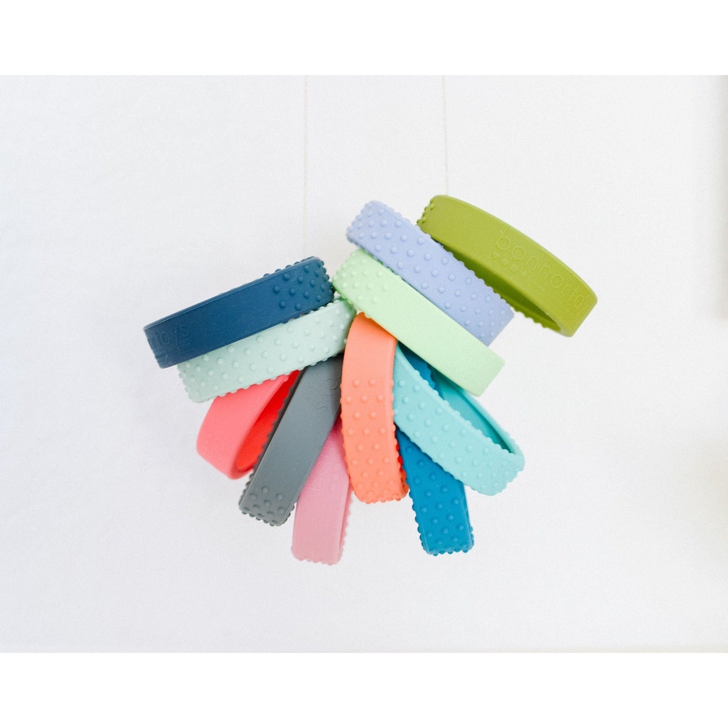 Teething isn't always fun, but it can sure be pretty with these silicone wrapped wooden teether! The new textured silicone wrap fits snuggly around a hard maple wood teether ring and is interchangeable if you want to swap out the color.   The entire toy can be tossed in the freezer for up to 1 hour, both the wood and the silicone will retain the coldness and be extra soothing on little gums.   It's lightweight and easy to hold, working on all those gross motor skills that are so important early on!