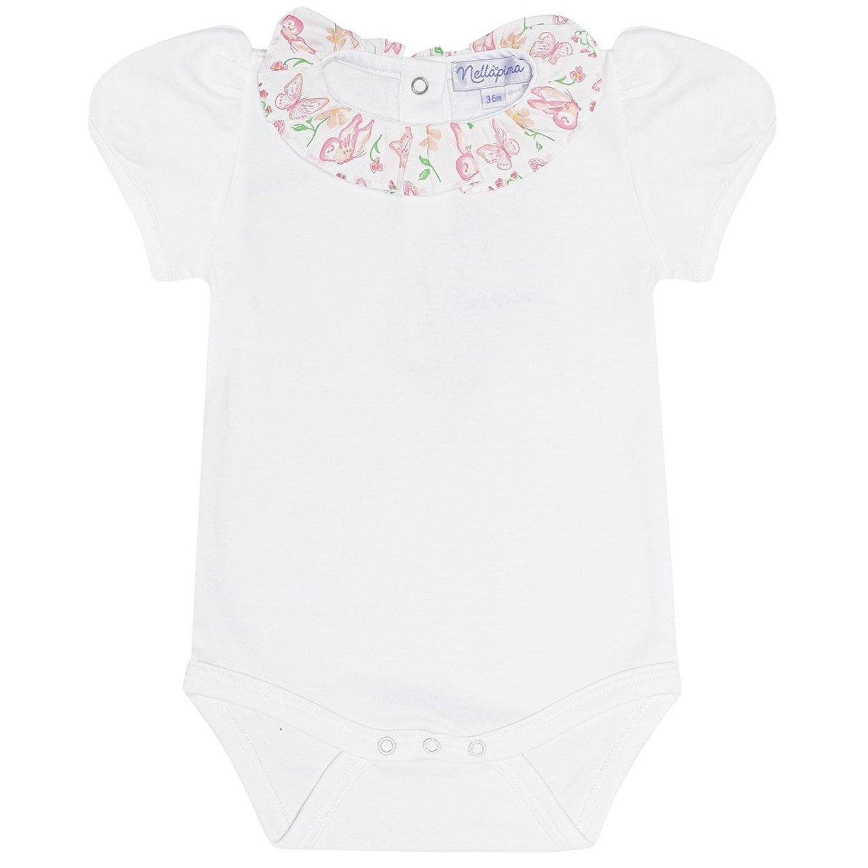 The pristine white onesie features a beautiful ruffle collar made of the enchanting butterflies print, adding an extra touch of charm to this adorable outfit.