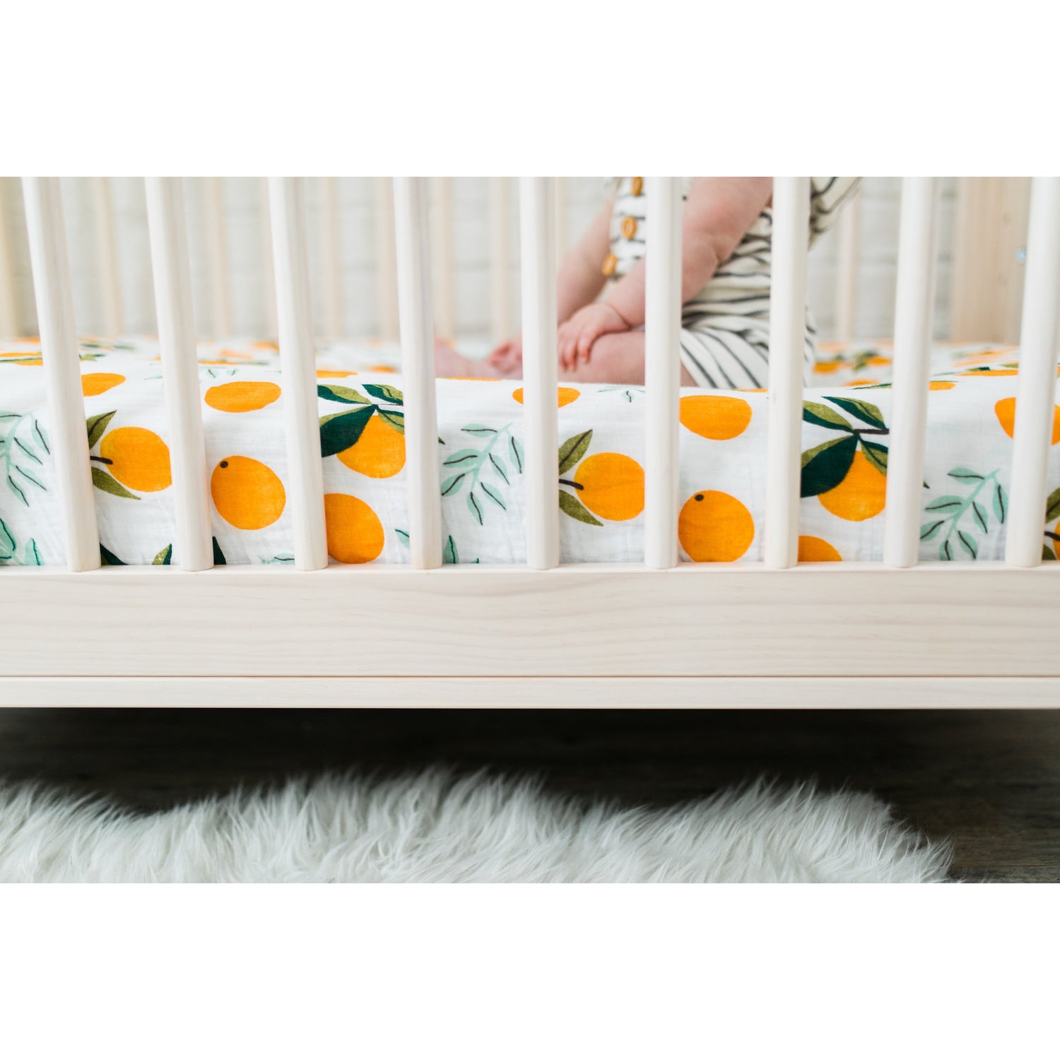 Citrus-ey and fresh colors you and your little cutie will love. This Clementine Crib Sheet is our most popular sheet pattern, and it's easy to see why it is loved so much!  The pattern is dotted with clementines, earthy olive and forest green leaves, and minty ferns.