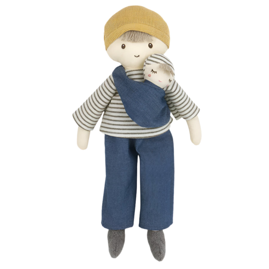 Meet Dada & Baby Doll duo! Dressed in a classic striped shirt, denim pants, and a cozy mustard knit beanie, Dada is ready for endless adventures with his little one snugly tucked into a baby carrier. With their sweet, matching smiles and adorable style, this charming pair is perfect for little ones who love to play pretend. A fun and delightful addition to any doll collection, they're ready to bring hours of imaginative play and cuddles to your child's world.