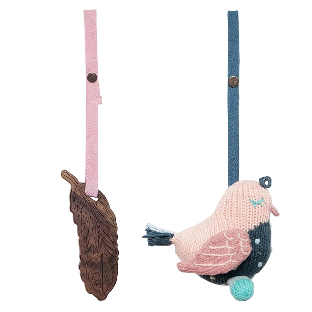 The wood toys are made from untreated hardwood and finished with vegetable seed wax. The knit toys were hand-knit at an artisanal women's collaborative in Peru using organic cotton yarn. Our stroller toys can be used on their own or attached to our "Play Gym".