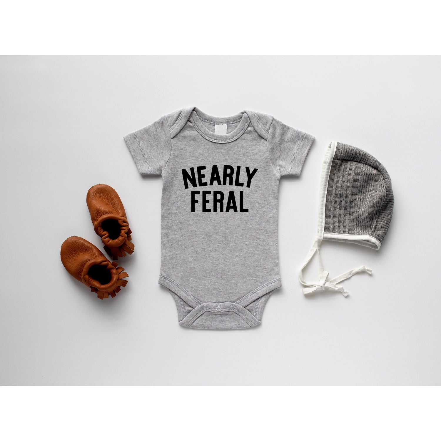 For the wild child who's just barely domesticated enough to live inside your home! This super-soft, 100% organic cotton outfit features modern typography on a luxe cream or gray colored bodysuit - designed with love and screen printed in-house. Short and long sleeve options.