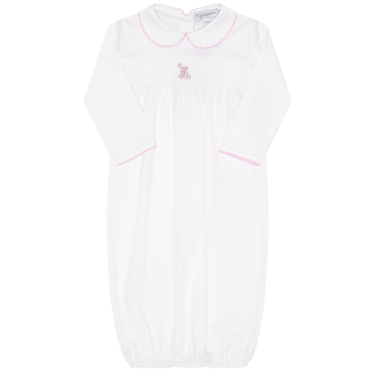 Introducing our delightful White Gown with Pink Bear Embroidery  – a bundle of cuddly charm designed to make your baby's early moments even more special. Crafted with love and attention to detail, this gown features an adorable pink bear embroidery and a touch of playful pink picot trim on the neck, creating a picture-perfect ensemble that's ready to captivate.