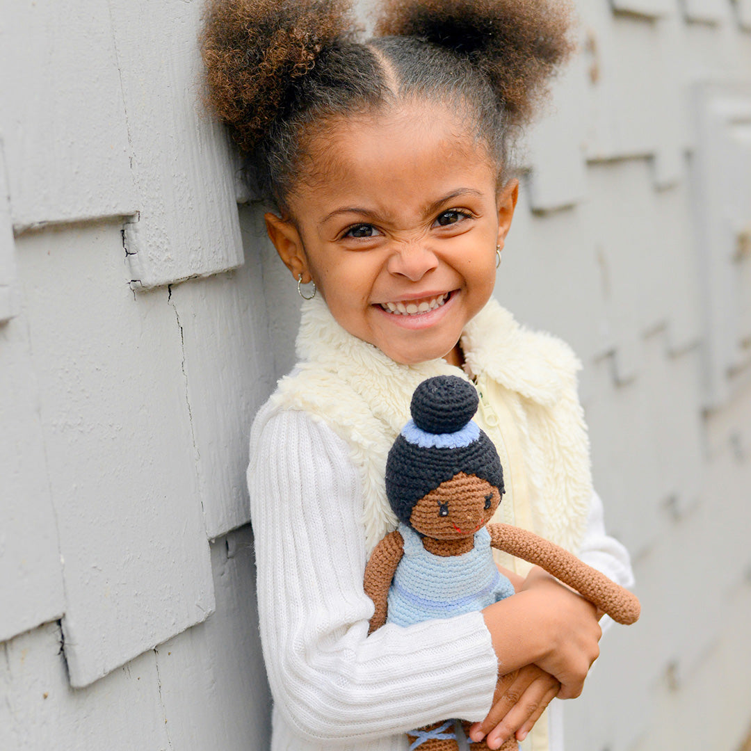 Dressed in a gorgeous tutu and with a very friendly smile, this ballerina doll is as pretty as a picture. Her skin is velvety soft and she loves adventures. This heirloom doll has been handmade with love and is ready to dance with your little star! Perfect for encouraging your child in imaginative play and story telling. Black baby doll has a blue tutu and White baby doll has a pink tutu.