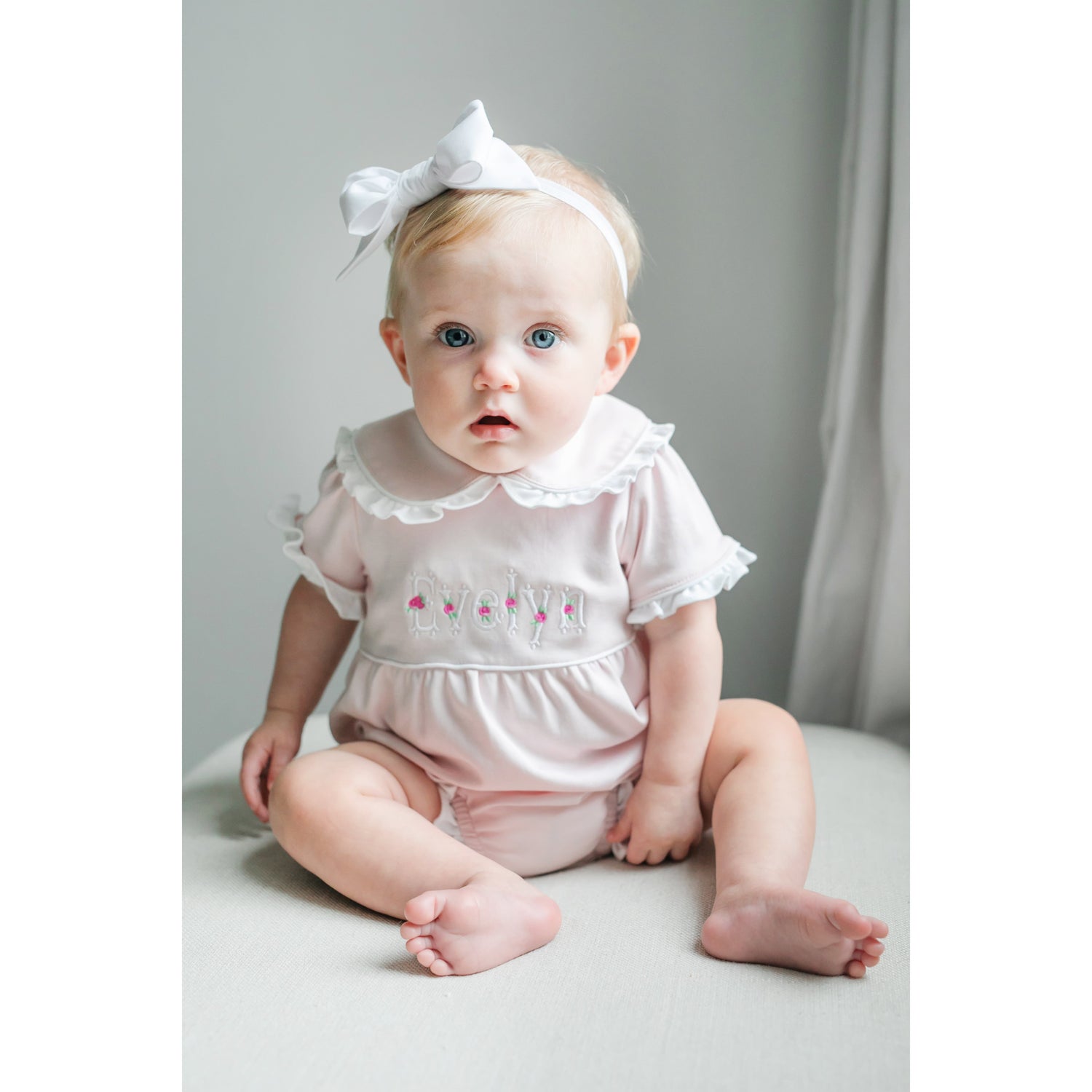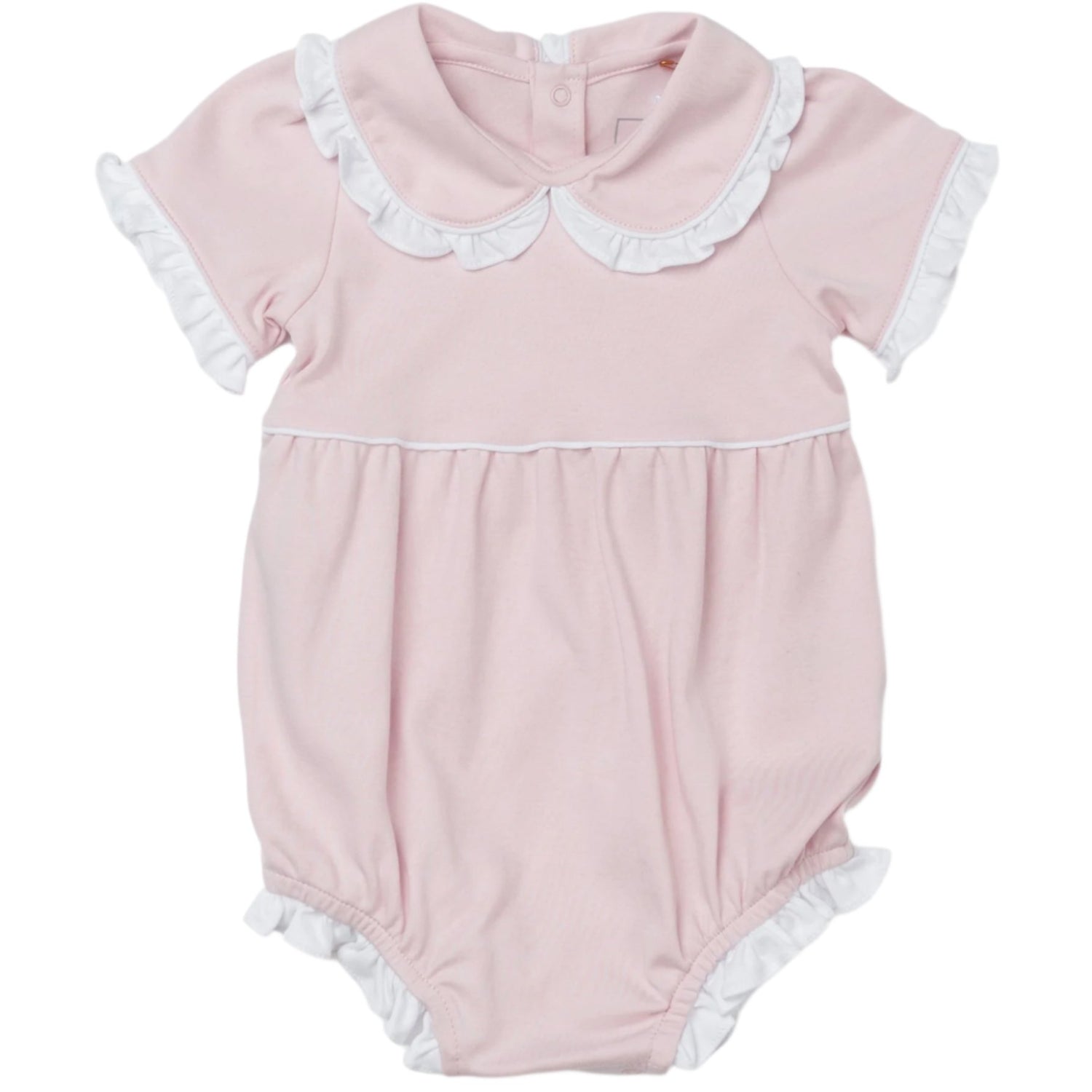 Girls' ruffled peter pan collar short sleeve pima bubble. Button closure in back and three snaps in the stride.