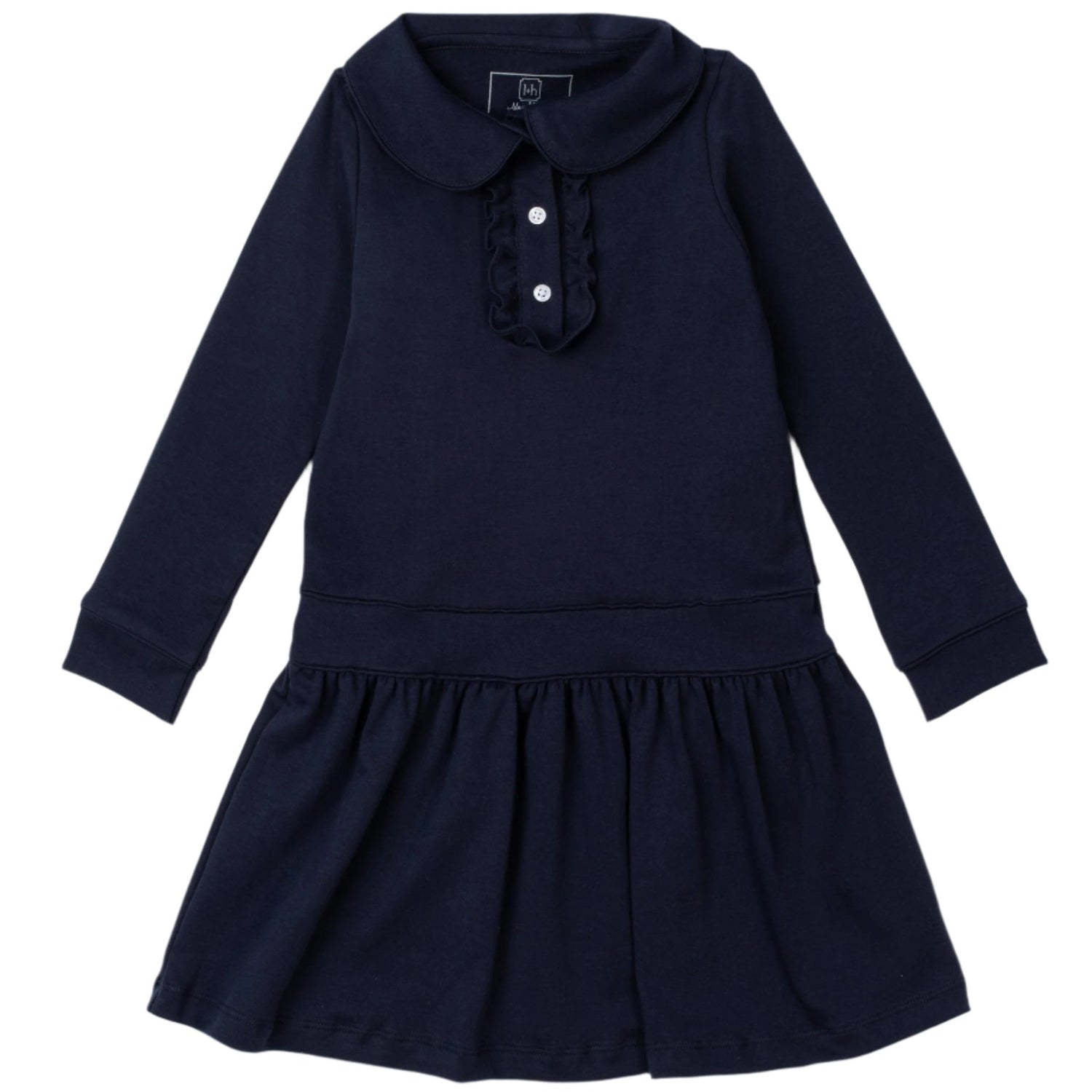 Pima cotton girls' long sleeve peter pan collar dress with ruffled button plackets and drop waist. Approved for many school uniforms.