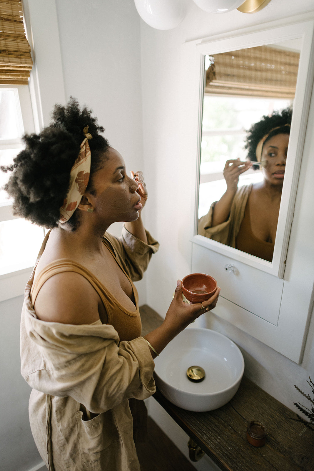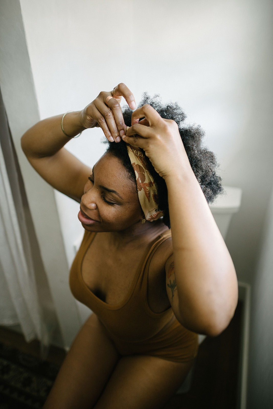 - Beige bandana with rust-colored design.