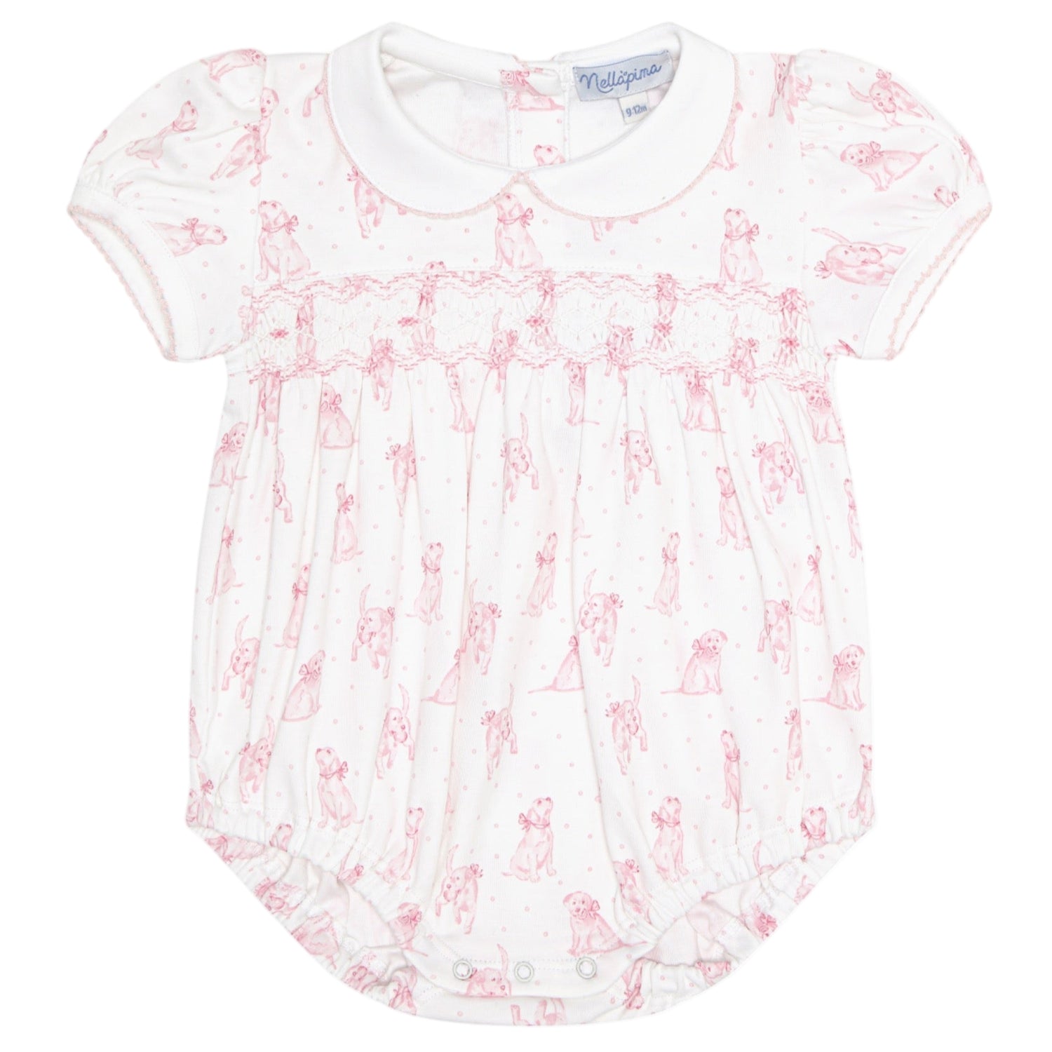 Pink Puppy Love Print Smocked Bubble - Pink / 0 - 3M is backordered and will ship as soon as it is back in stock.