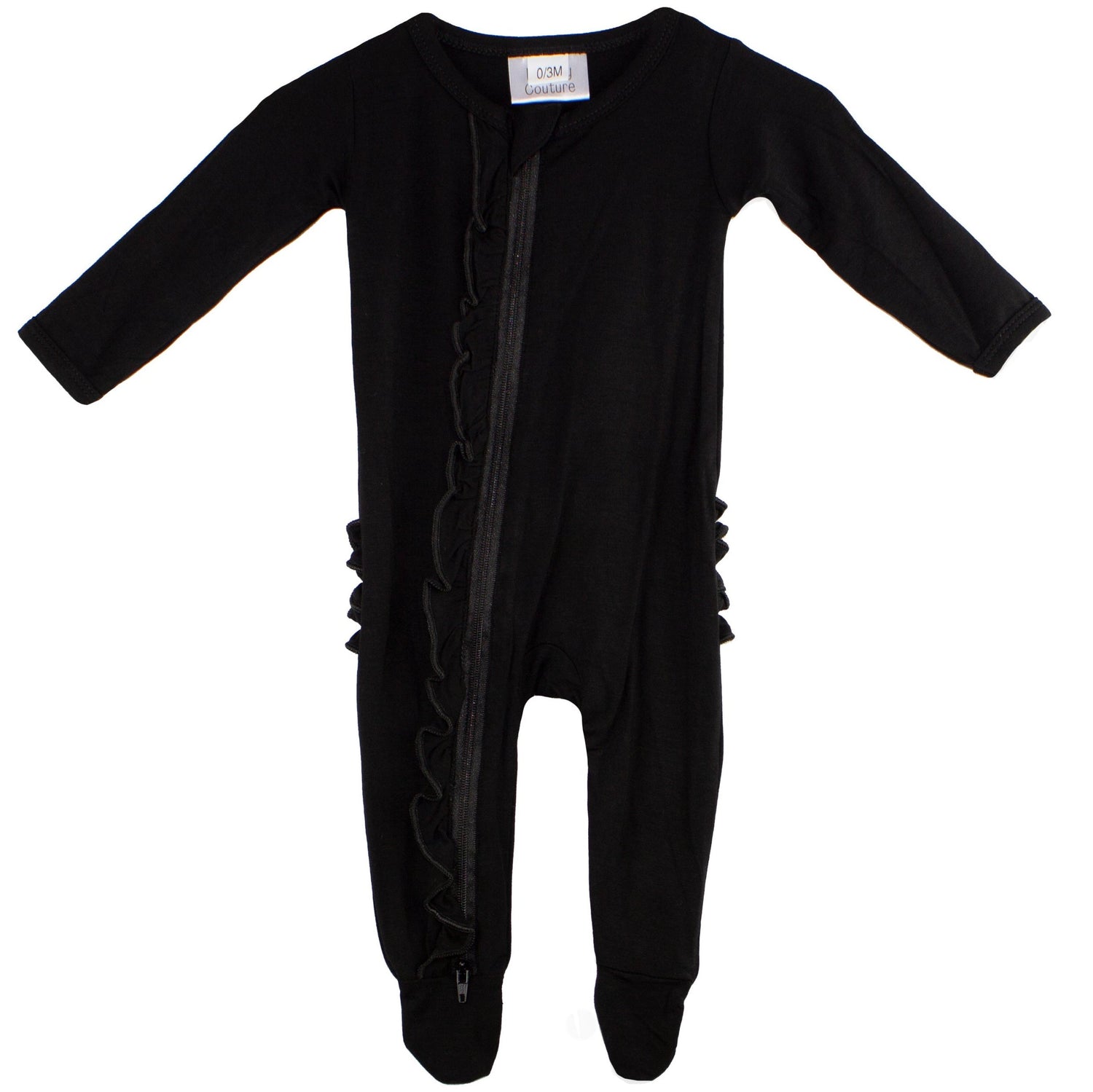 Ruffle 2 Way Zip Romper - Black - Newborn is backordered and will ship as soon as it is back in stock.