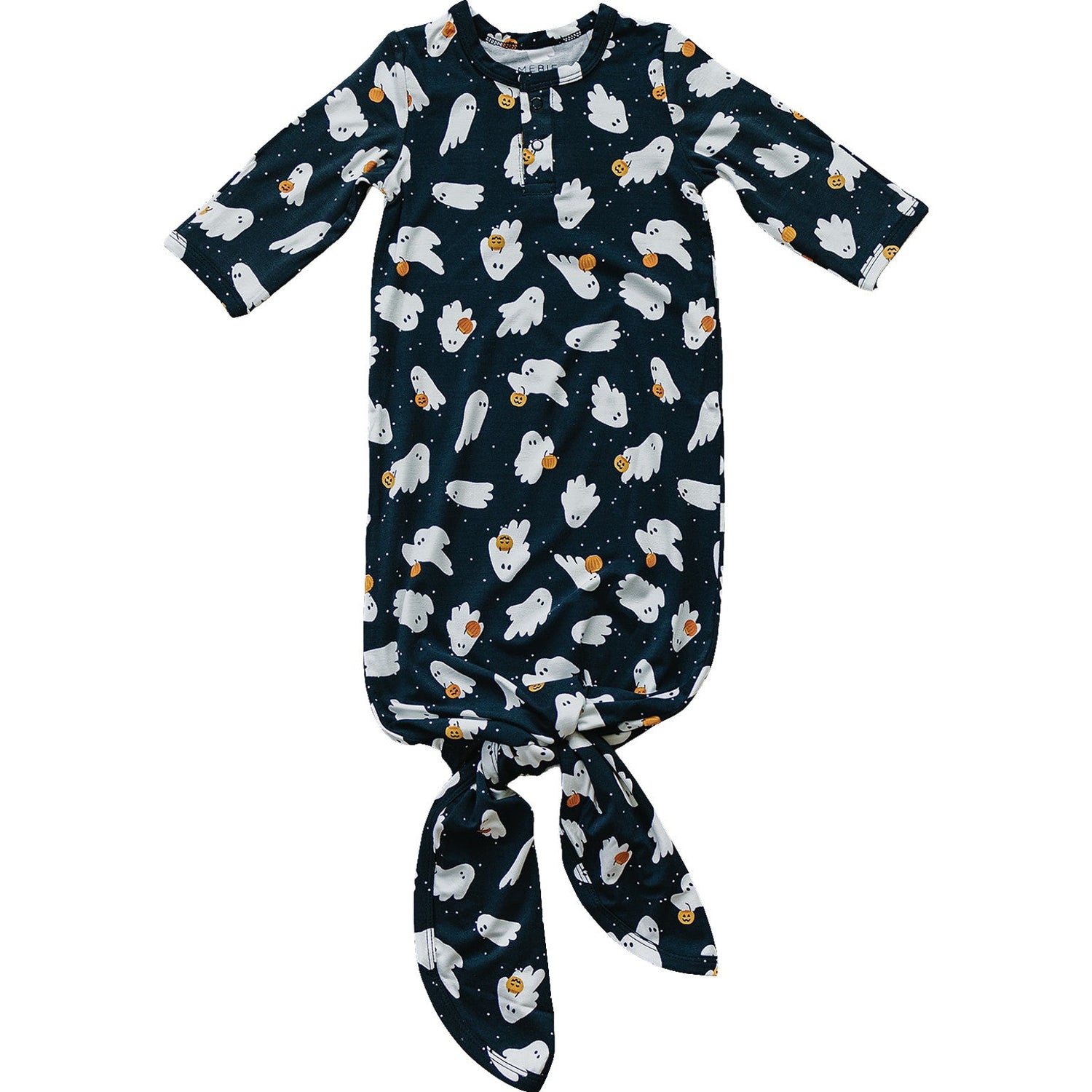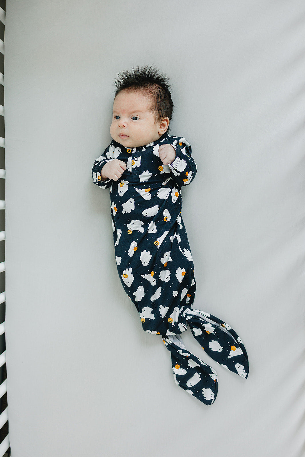 These gowns are size 0-3. We love these Halloween Themed Gowns. They are made out of supremely soft Bamboo Rayon to keep your little one comfortable. We have a variety of gender neutral designs and colors making them perfect for any baby. They have fold over hands and two snaps for easy on and off. We also have shoulder flaps to make it easily pull over your little ones head, we want to make dressing your baby as easy as possible. The bottom is easily tied and untied in a knot for no-fuss diaper changes which makes it a newborn baby essential! These are made out of the same fabric as our stretch swaddles and match the colors of the stretch swaddles, head wraps, and hats.
