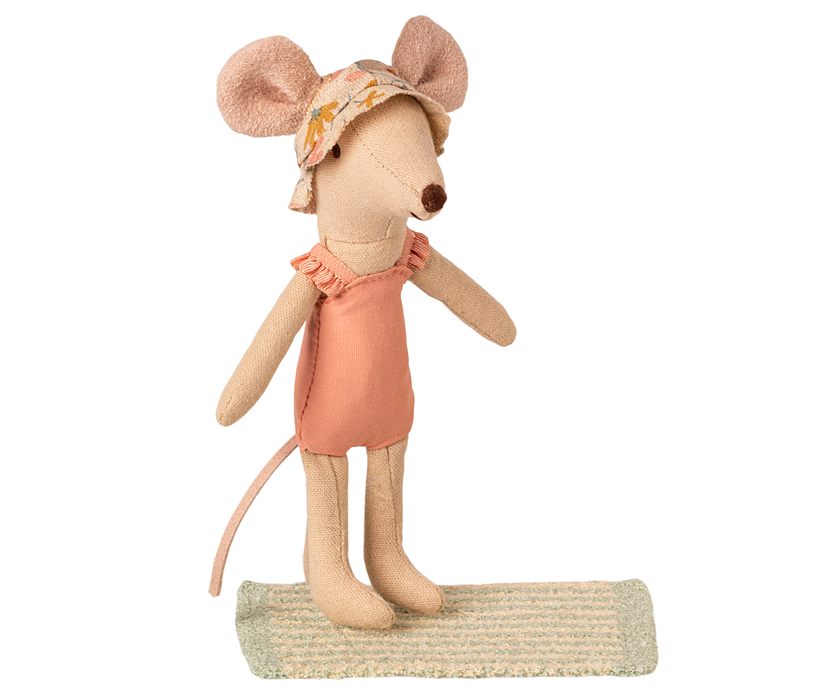 Vacation time! This set includes all essential accessories for a fun day at the beach: a bathing suit, sunhat, and a towel. It all fits the mice in size big brother/sister perfectly.