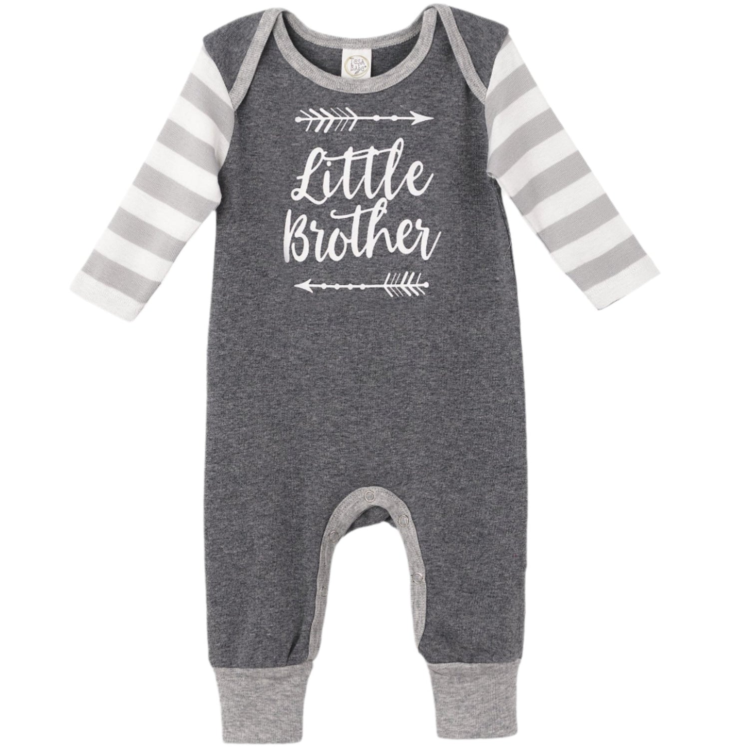 Introduce your little one to the world in style with this cool and cozy "Little Brother" romper! Crafted with oh-so-gentle 100% cotton, it features a sleek grey stripe plus soft heather grey trim. Easy-peasy snaps underneath make it a breeze to change diapers. Get your tiny sidekick ready for a world of adventure—order today! (Hat sold separately).