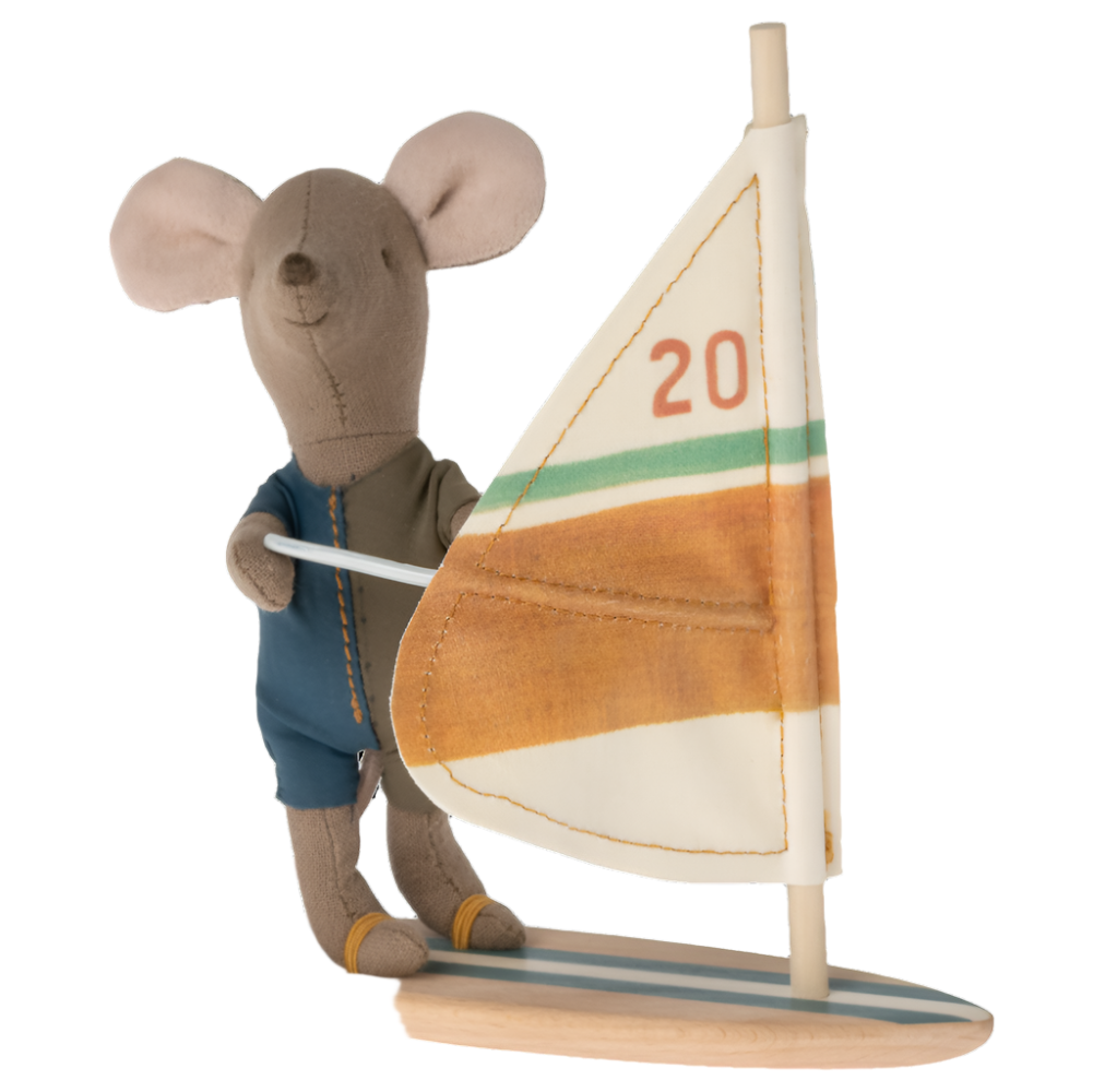 Little brother is learning how to surf alongside his sister! He’s wearing a half n half colored wetsuit that is dusty blue and forest green. His surfboard is dusty blue and off-white striped and his sail matches his sister marked with #20. The surfboard includes two elastic straps at the bottom so he can keep his feet in place. He also has magnetic hands, so he can steer his sail wherever he wants to go!