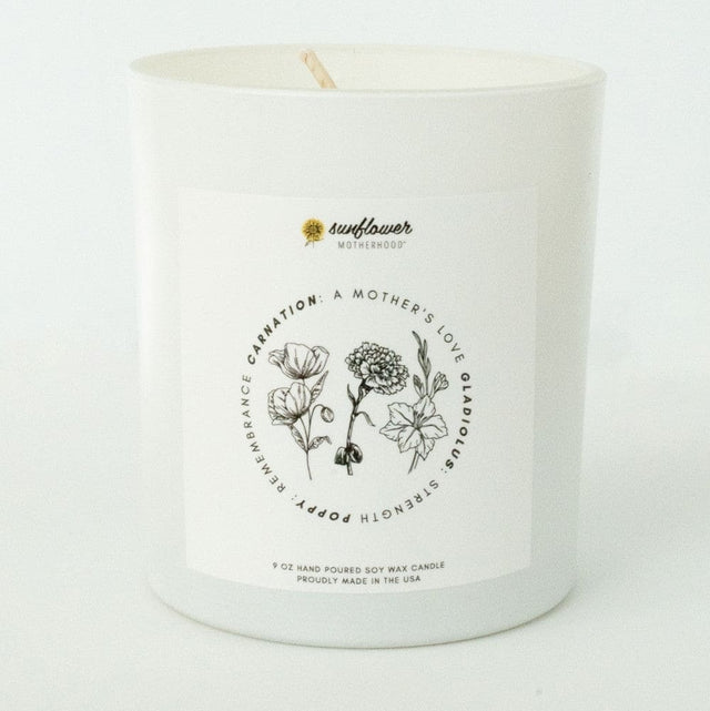 • With a symbolic message and soothing chamomile scent, our Remembrance Healing Candle is designed to bring healing and processing to a grieving mother. Whether she is grieving the loss of her child or the loss of her own mother, this candle honors maternal grief with three floral symbols. The carnation represents A Mother's Love, the gladiolus represents Strength and the poppy represents Remembrance.