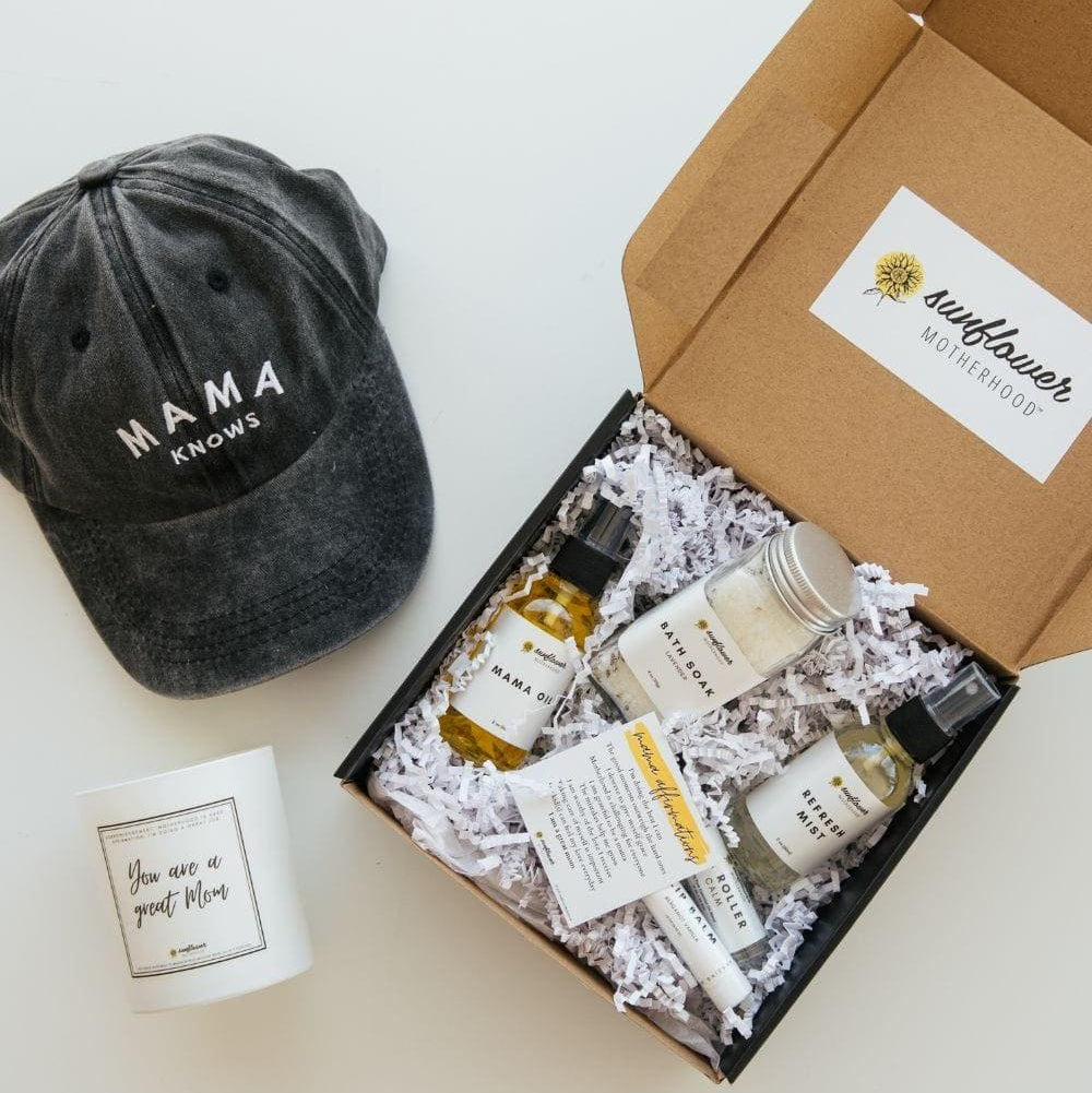 Looking to send something to a mama in your life who is out of the pregnancy and postpartum process? Maybe her kids are a toddlers now or even a bit older - but trust us, she still needs love and support! Remind her she's a wonderful mother with our Great Mom Candle that has an affirmation on it and smells amazing. The Self Care Gift Box will give her five different items that will help her create small moments of care and love toward herself. All of these products are made in the USA without parabens, sulfates, dyes, or any other yucky ingredients! Lastly, she'll get our Mama Knows Hat which will become her new closet staple for those busy mom days.