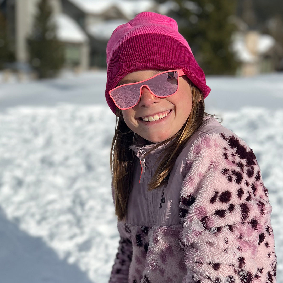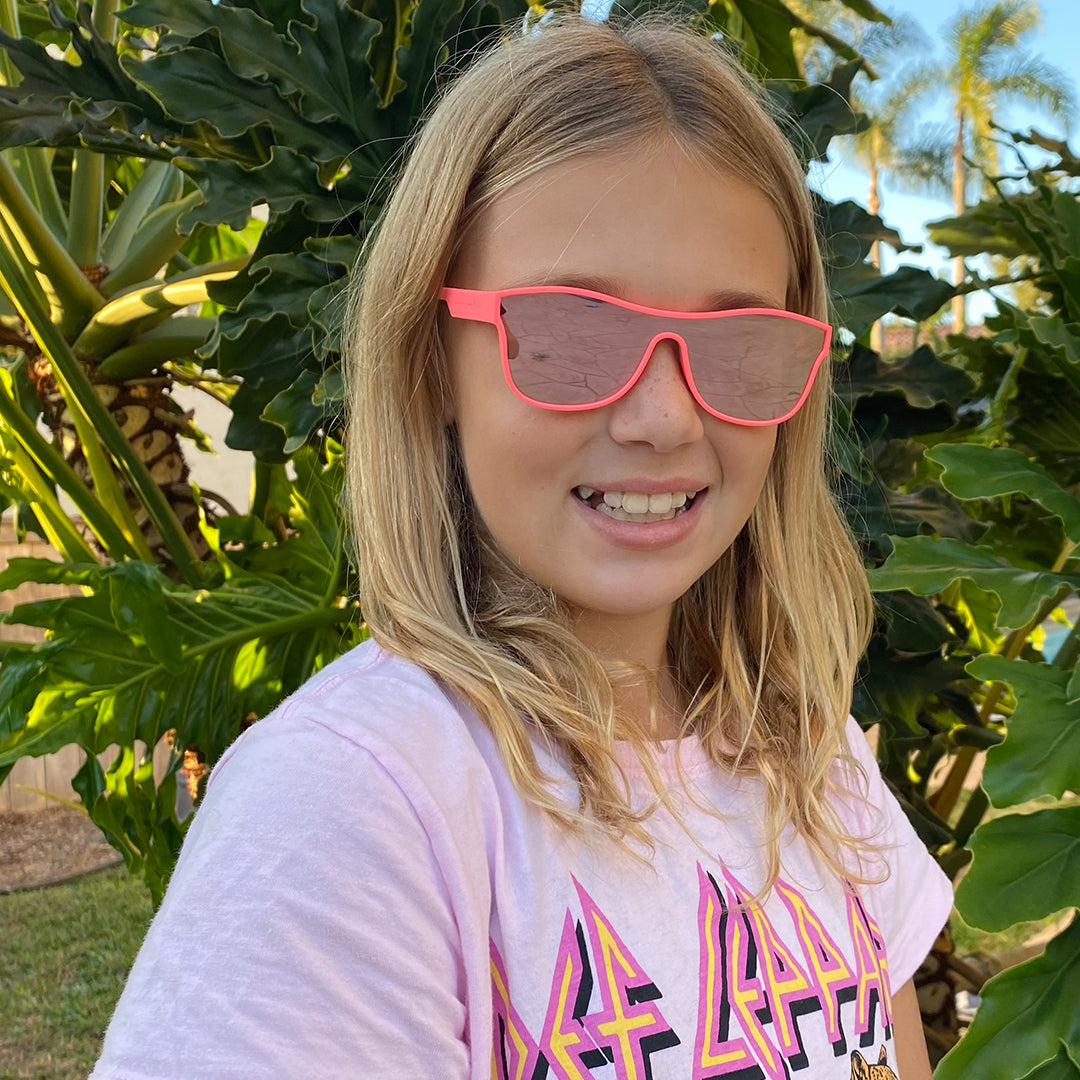 These hot pink single shield toddler sunglasses are inspired by the iconic Saved by the Bell character, Slater, with his vibrant and retro-cool style. Our Teen-Adult size fits ages 15+ depending on head size. Named after the coolest hang out of the Bayside High crew—The MaxRoshambo's newest style of sunglasses melds super-neon, fun-spirited frame colors and mirrored polarized lenses for the coolest combos!