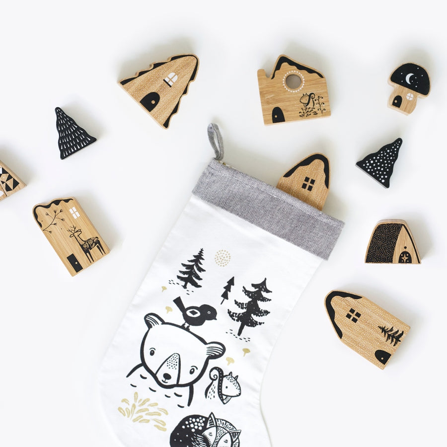 Welcome to the enchanted Woodland Village! Explore each unique little house and tree made of sustainable and sturdy bamboo. You might see a squirrel, you might find a deer, and you may find a house that is shaped like a mushroom. A perfect miniature set for imaginative play that can double as lovely woodland decor. You won't want to put it away