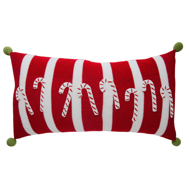 This knit holiday throw pillow adds a sweet touch to your seasonal décor with its charming candy cane design. Featuring a vibrant red and white striped background adorned with classic candy canes, this pillow evokes the warmth and joy of the holiday season. Green tassels at each corner add a playful finish, ensuring this pillow will be a festive favorite year after year.
