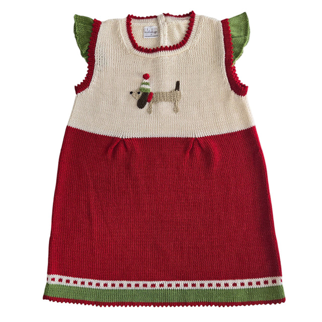 Full of charm and cheer, this hand-knit Christmas dress is perfect for festive celebrations. Featuring a sweet pup in a pom-pom hat and scarf, the cream and red color block design is accented with fluttery green sleeves.