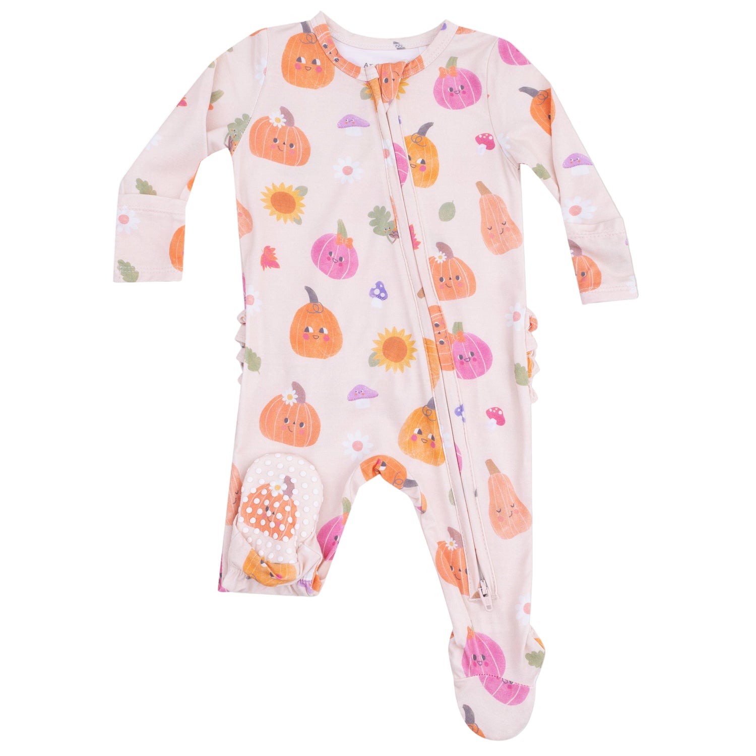 2 Way Zipper Ruffle Back Footie - Autumn Pumpkins - Pink