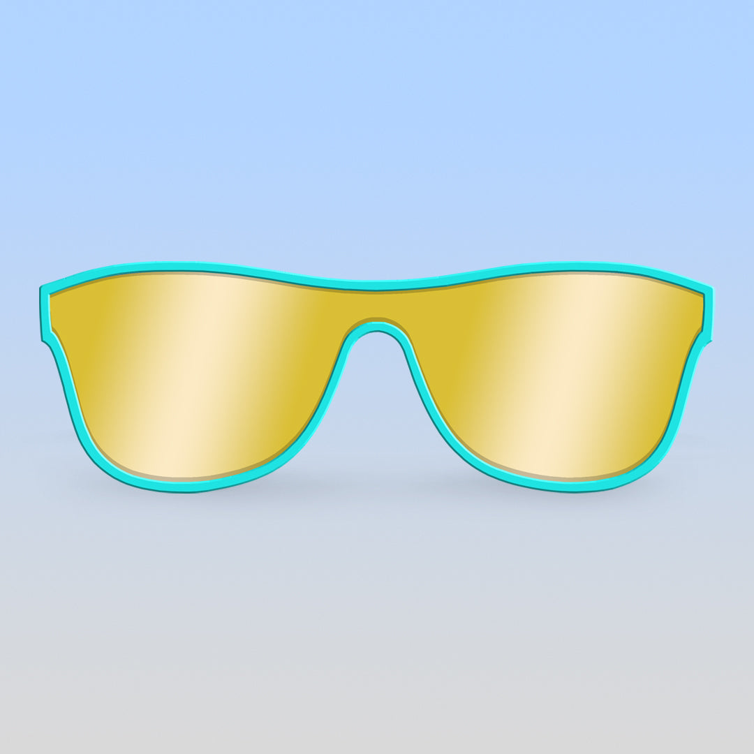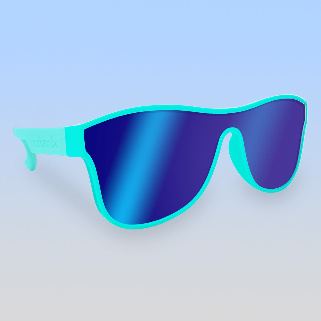 These Weird Science teal single shield sunglasses radiate an effortlessly cool and nostalgic vibe right out of the 80s. Our "giant" adult size is just a little larger for that oversized look. Named after the coolest hang out of the Bayside High crew—The Max—Roshambo's newest style of sunglasses melds super-neon, fun-spirited frame colors and mirrored polarized lenses for the coolest combos!