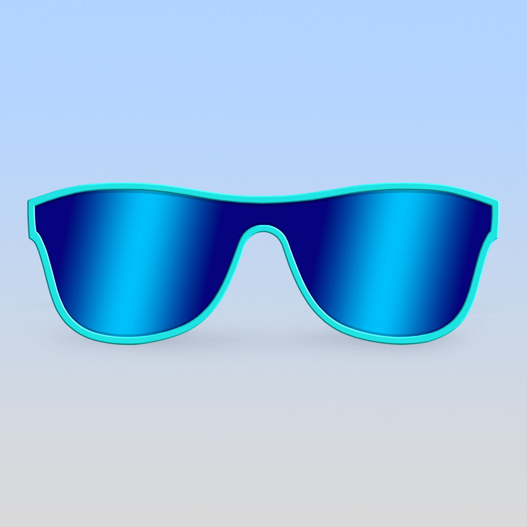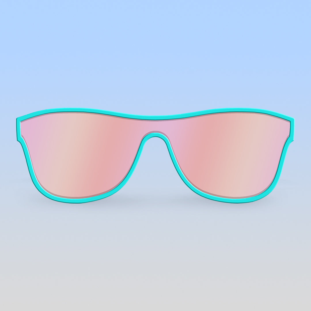 These Weird Science teal single shield toddler sunglasses radiate an effortlessly cool and nostalgic vibe right out of the 80s. Named after the coolest hang out of the Bayside High crew—The Max—Roshambo's newest style of sunglasses melds super-neon, fun-spirited frame colors and mirrored polarized lenses for the coolest combos!