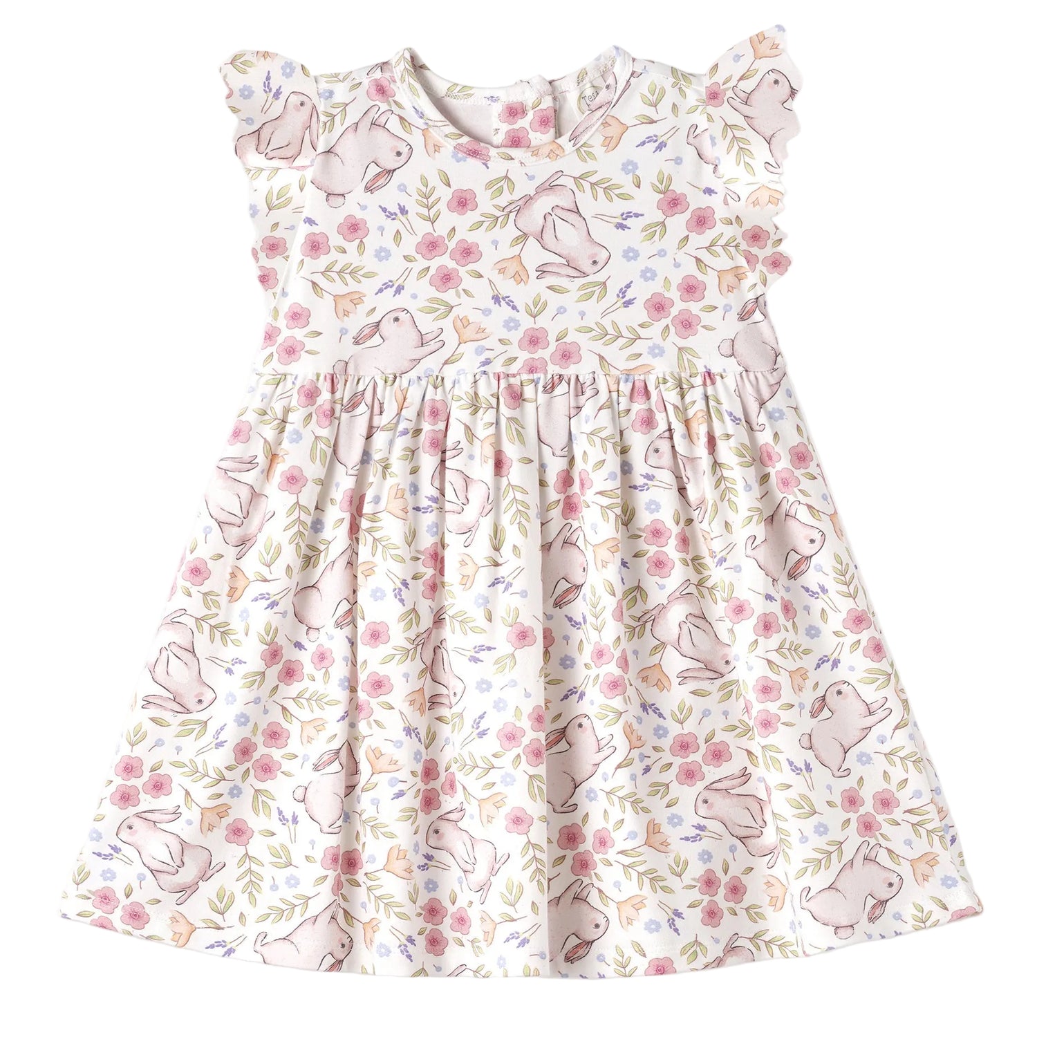 Celebrate Easter in soft, springtime style with the Bunny Blooms dress—crafted from a luxurious bamboo-spandex jersey that’s as gentle as it is gorgeous. Naturally absorbent, hypoallergenic, and eco-friendly, it offers breathable comfort all day long. Featuring a charming bunny-and-blooms print and delicate flutter sleeves, this dress brings a touch of seasonal sweetness to any special moment. Back buttons make dressing easy, while the full skirt adds a classic finish to this festive favorite.