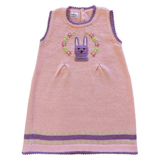 Lovingly hand-knit, this soft pink dress features a darling lavender bunny at the center, surrounded by hand-embroidered floral details for an extra dose of whimsy. Thoughtful accents, like delicate purple trim along the neckline and hem, add a playful contrast, while gentle pleating ensures a comfortable and flattering fit.