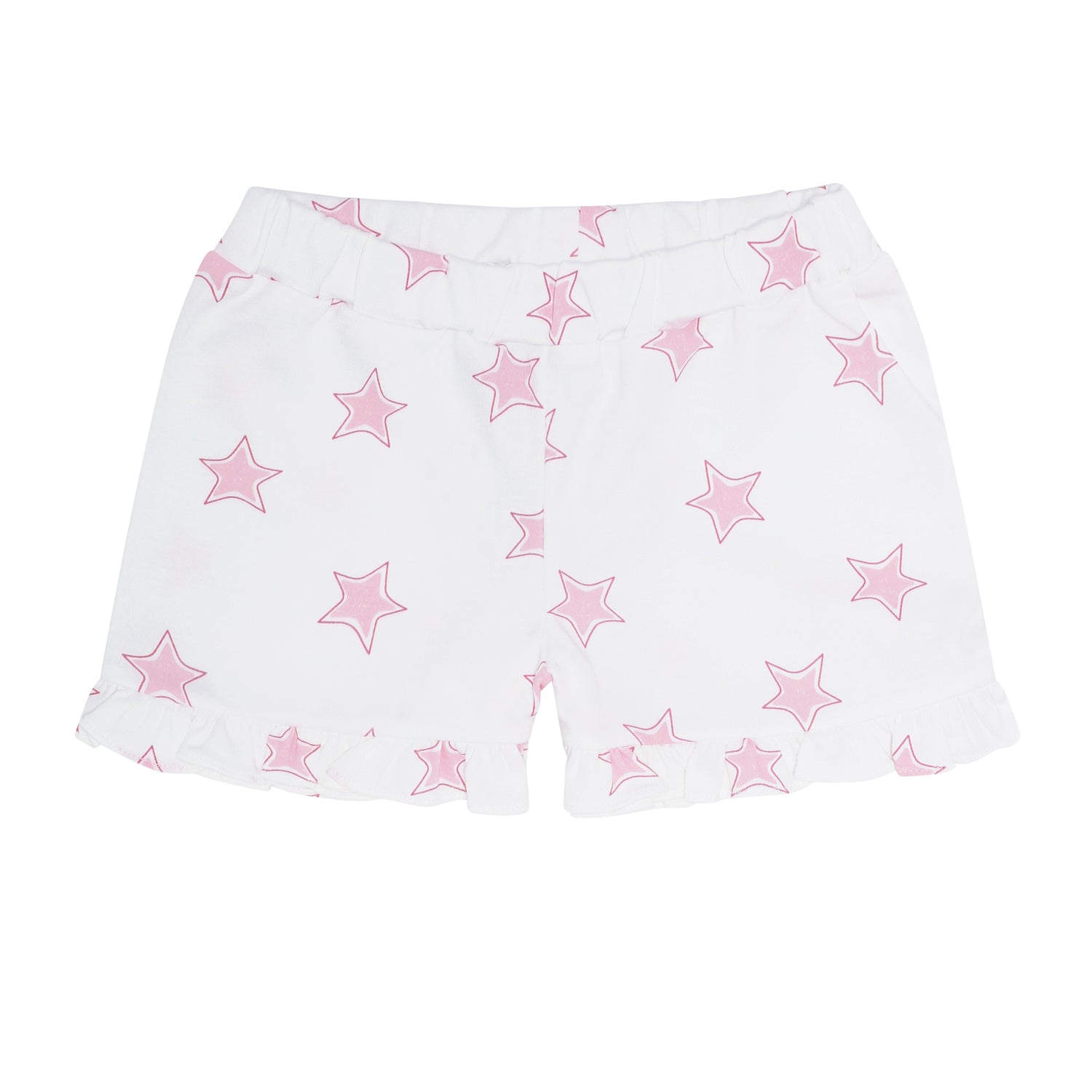 An amazing blend of comfort and style for your little one! This set features soft pink shorts adorned with playful stars, perfectly paired with a white top that boasts a ruffle neck with the same star print.
