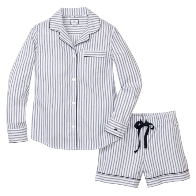 Women's Twill Pajama Long Sleeve Short Set in Navy French Ticking - XS is backordered and will ship as soon as it is back in stock.