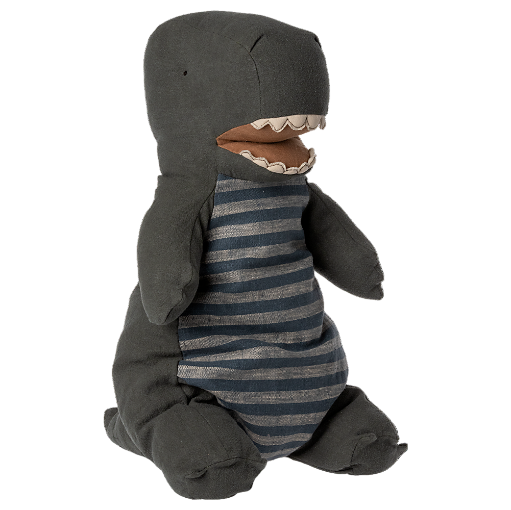 Look at this funny friend! A large Gantosaurus with big teeth has arrived and is ready to play with all of us. It is made in a soft mix of ramie and cotton, the striped stomach is made in a very nice blend of linen and cotton.
