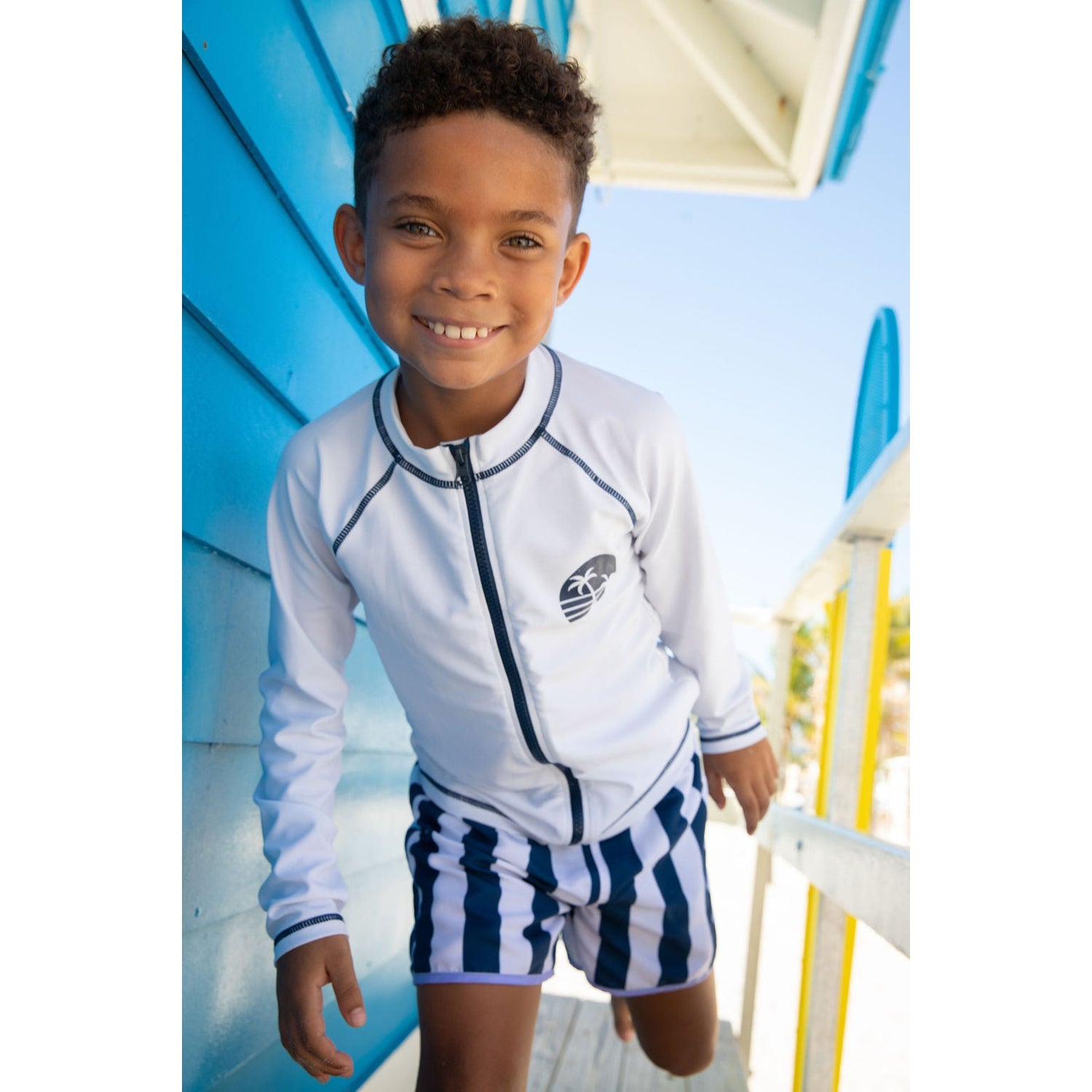 Print: Classic yet trendy a nautical inspired navy blue and white trim is a great staple piece in his beach attire wardrobe.