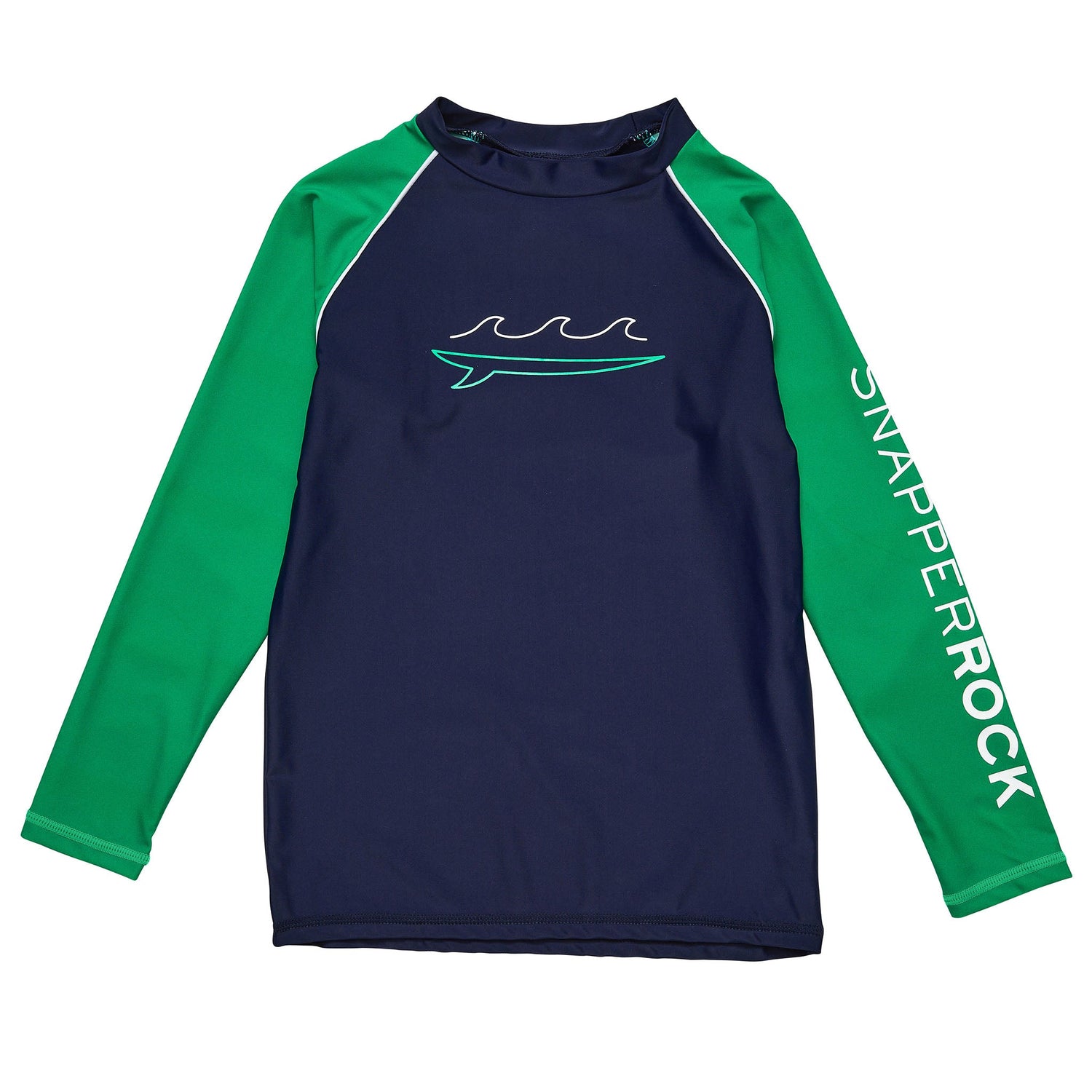 In our UPF50+ sun-protected rash guard for boys, your little dude will be cutting through the surf feeling fin-tastic! In long green sleeves and a bold navy front and back with bright white piping, he'll blend into the ocean tones just enough to become one with the waves.