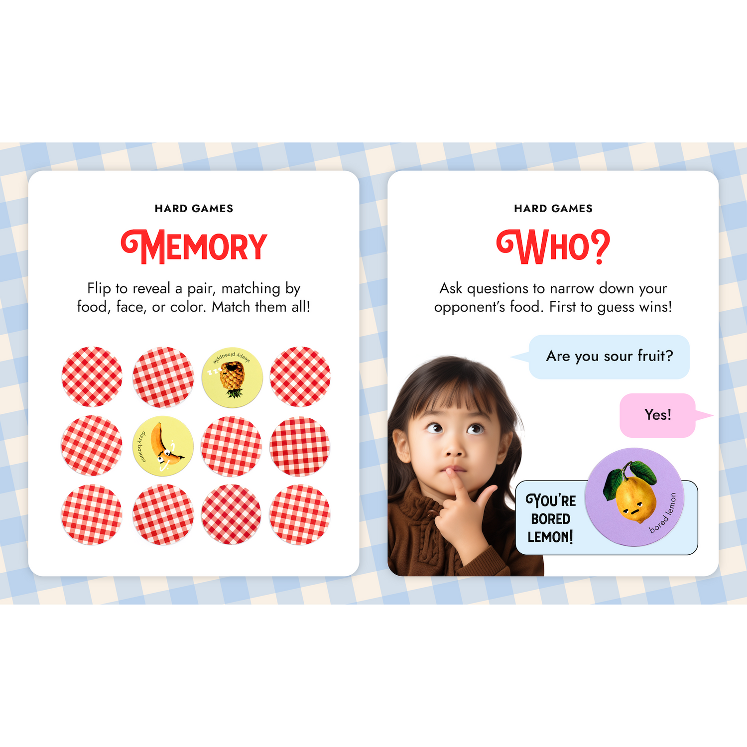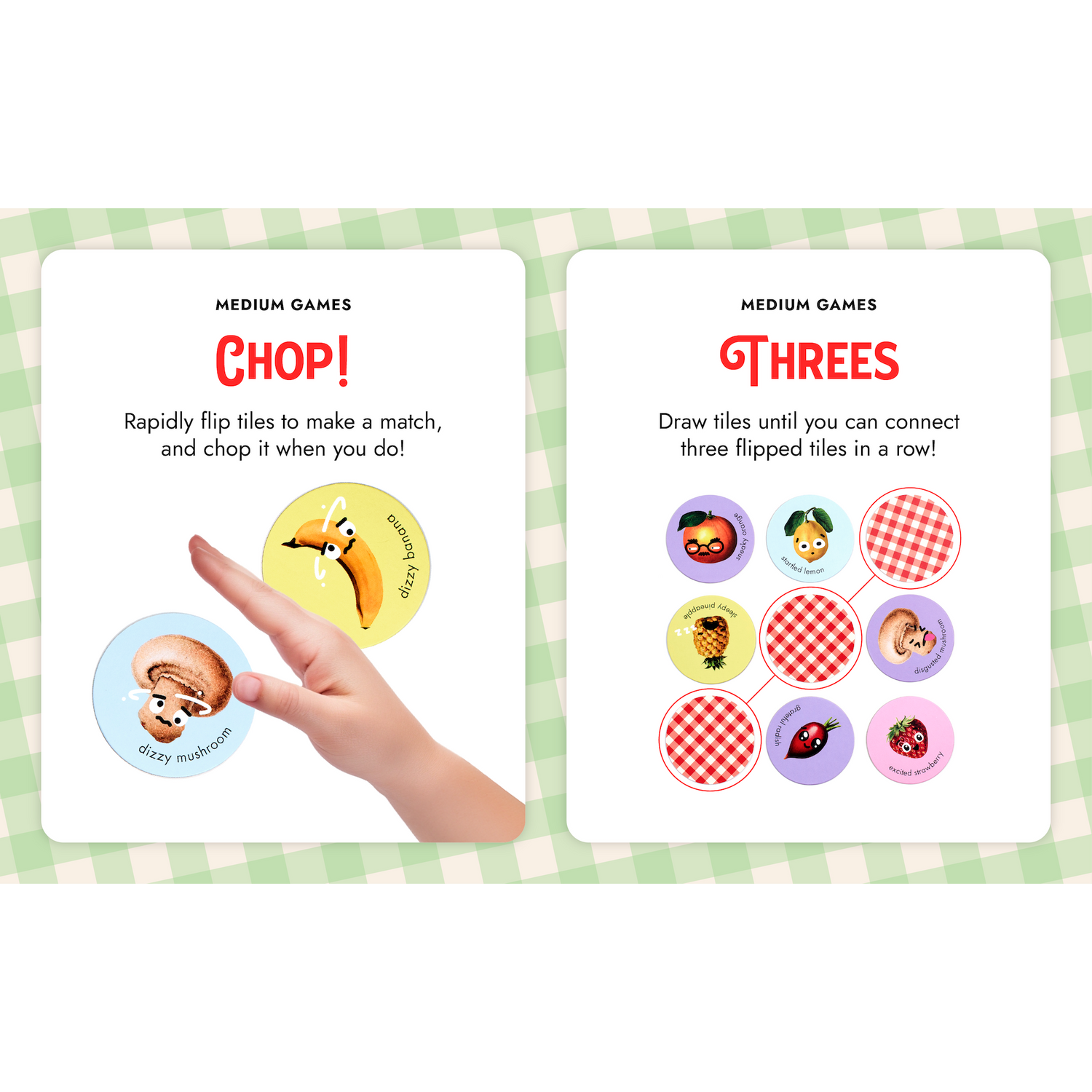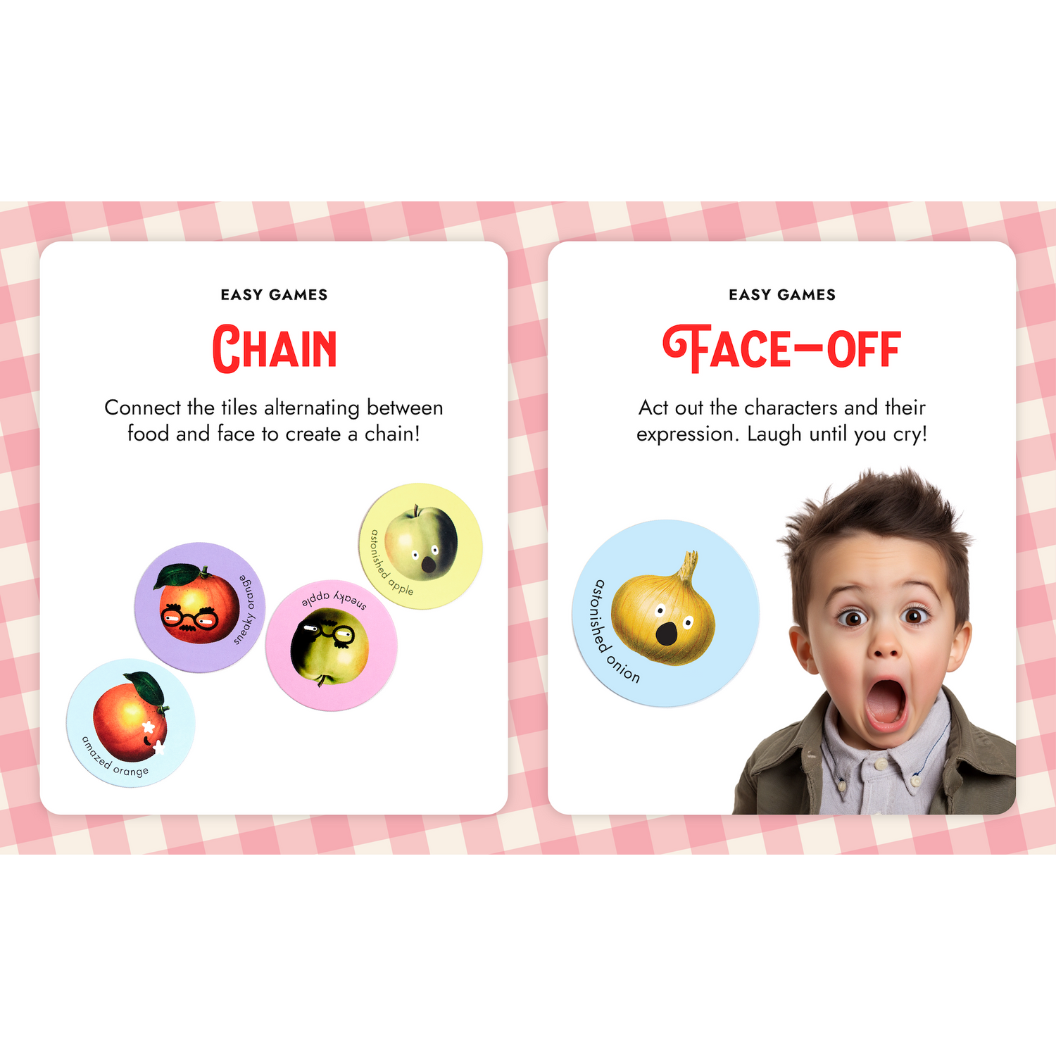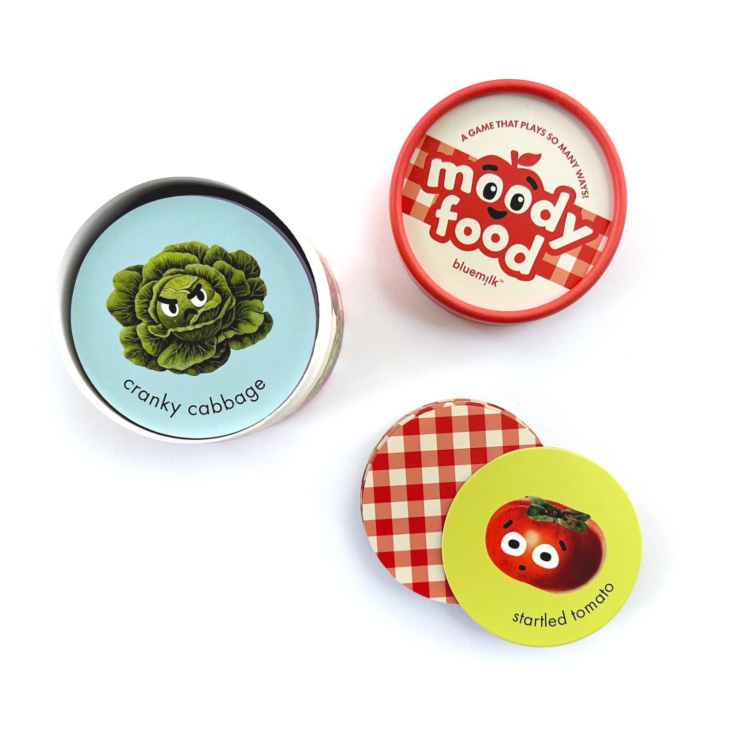 Moody Food is an all-in-one game set containing 6 beloved, classic card and board games, with a unique twist. 36 round one-sided tiles are divided into 4 colors with pictures of organic food types and expressions. Players of all ages are on a quest of varying difficulty, ranging from 1 to many players.