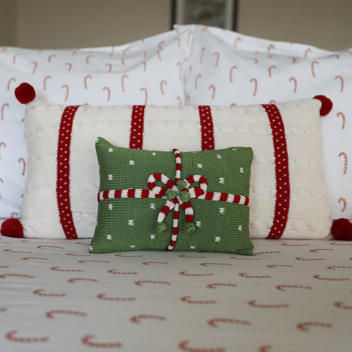 Enhance your holiday décor with this elegant knit holiday throw pillow. Featuring a classic cream cable-knit design, this pillow is beautifully accented with rich red stripes, adding a festive touch to your home. The playful pom-poms at each corner bring an extra layer of charm, making it a delightful addition to any holiday setting.