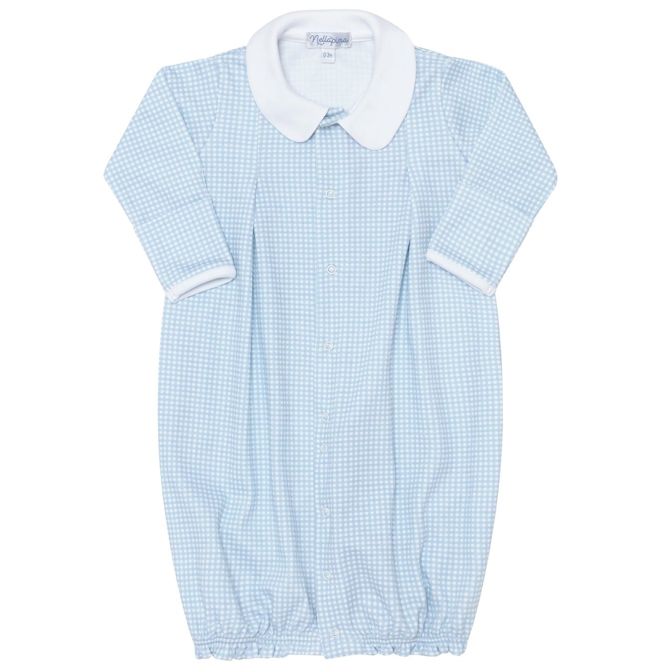 The Blue Gingham Converter Gown boasts a timeless pastel blue color and a crisp white Peter Pan collar. Crafted from 100% Pima cotton, this gown is both stretchy and soft, making it ideal for your baby to play and crawl around in all day.