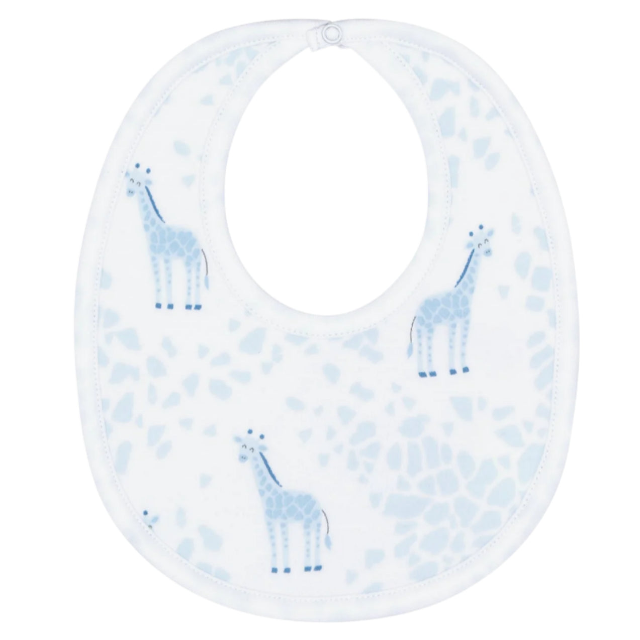 This bib features an enchanting blue giraffe print that adds a touch of playfulness to your little one's dining experience.