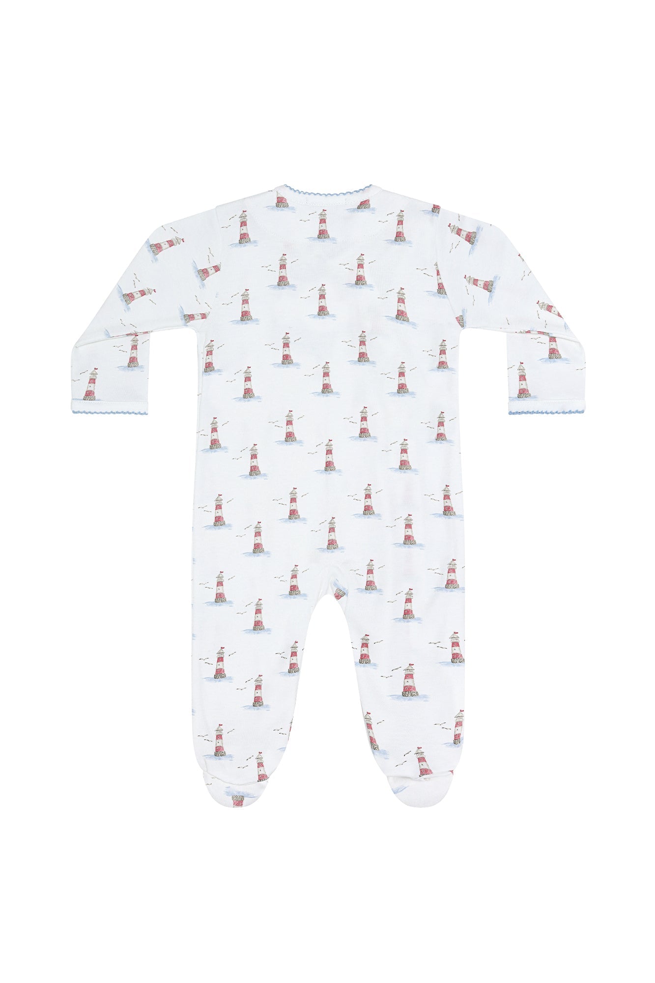 Keep your baby cozy and stylish with this Lighthouse Crossover Footie, made from premium 100% Pima cotton for unparalleled softness and comfort. Featuring an adorable lighthouse print, this footie is perfect for everyday wear or special moments. The crossover snap-front closure allows for easy dressing and diaper changes, while the built-in footies ensure your little one stays warm from head to toe. Finished with delicate trim details, this lightweight and breathable piece is gentle on sensitive skin, making it an essential for your baby's wardrobe.