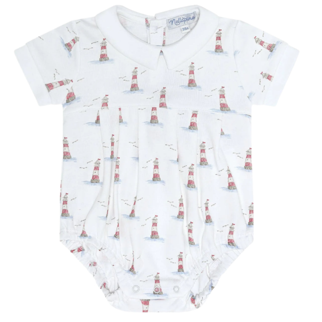Classic and charming, the Lighthouse Print Bubble is crafted from 100% premium Peruvian Pima cotton for the ultimate softness and comfort. Featuring a whimsical lighthouse print and a delicate white Peter Pan collar, this timeless piece is perfect for special occasions or everyday wear. With elasticized leg openings and snap closures, it’s designed for easy changes and all-day comfort. A delightful addition to your little one’s wardrobe with a touch of nautical-inspired elegance.