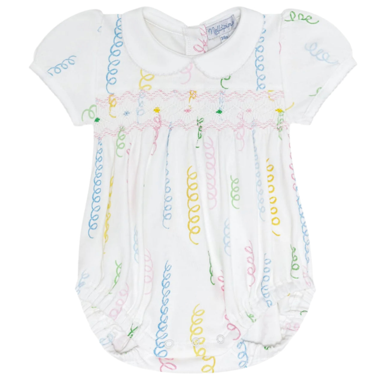 Delight in timeless charm with this Smocked Bubble, showcasing handmade smocking and the cheerful Spirals print. Made from 100% Pima cotton, it’s as soft as it is stunning.
