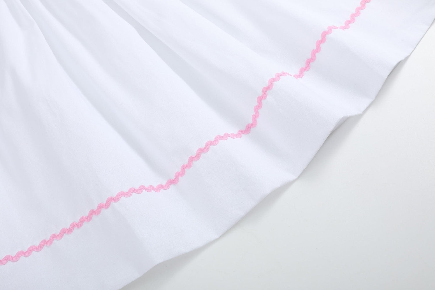 The flutter sleeves and soft pink rickrack trim offer extra detail and a light, airy feel, while the traditional bishop silhouette provides a comfortable fit and a graceful drape that falls to mid-calf or ankle length.