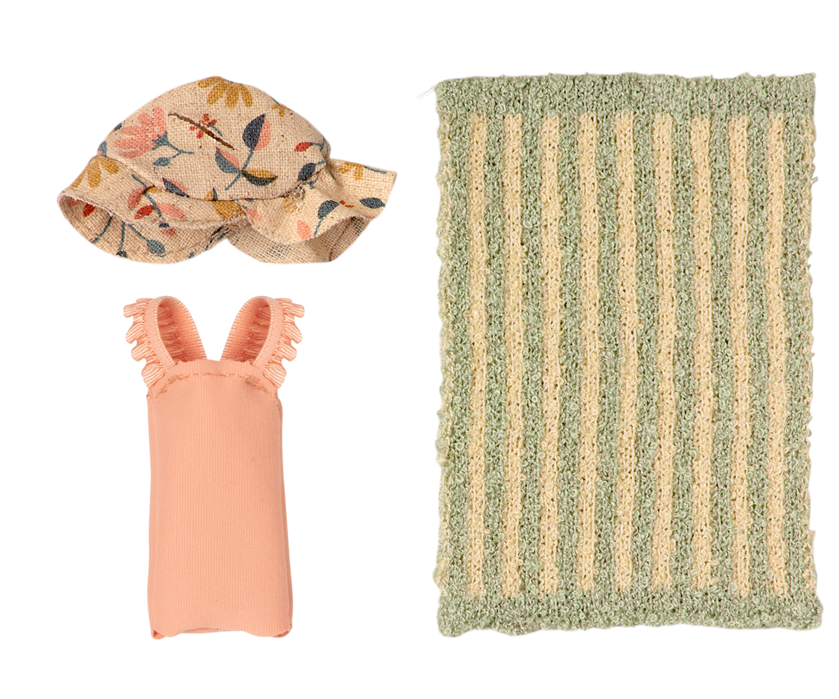 Vacation time! This set includes all essential accessories for a fun day at the beach: a bathing suit, sunhat, and a towel. It all fits the mice in size big brother/sister perfectly.