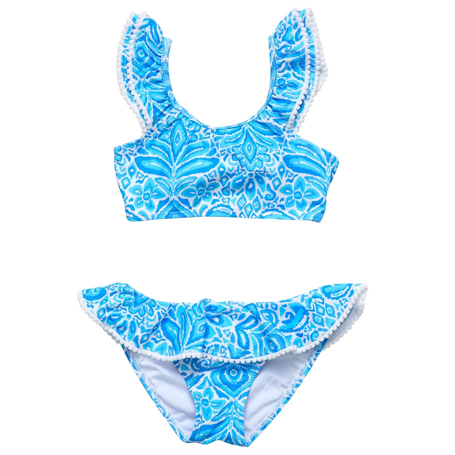 Don't settle for ordinary children's bikinis- brighten up your child's swimwear collection with the Santorini Blue Frill Crop Bikini. Made in our mesmerizing Santorini print, this bikini is adorned with shoulder frills, a playful mini pom pom trim and mock tie back, making this bikini a popular piece for any summer outing.