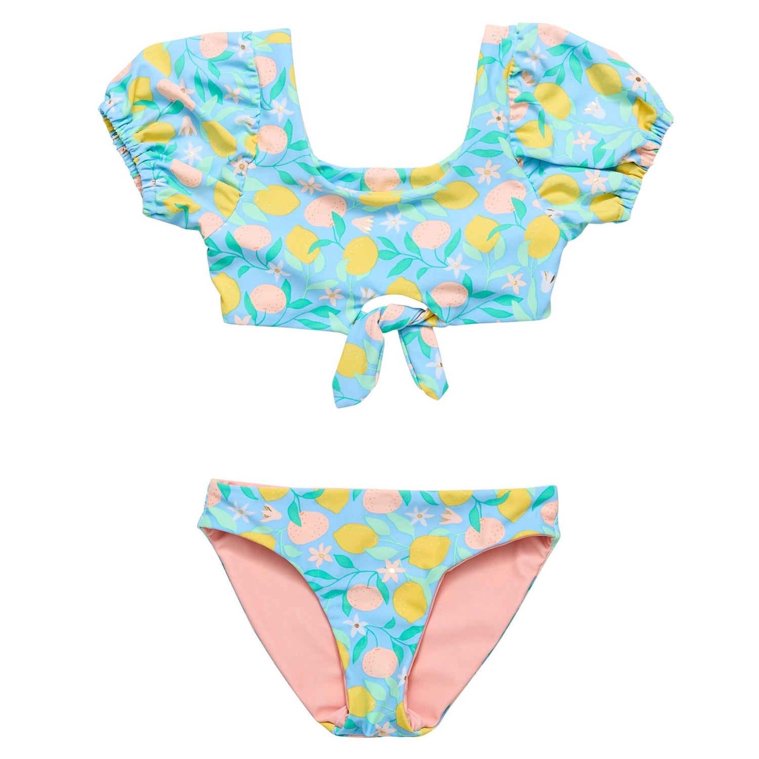 Our Lemon Drops collection is sunny and bright, ideal for a day of Vitamin D. Featuring a puff-sleeve t-shirt bikini top with a cute waist bow, this oh-so-sweet set comes complete with reversible bottoms that can be pretty in peach one day and luscious in lemon the next.