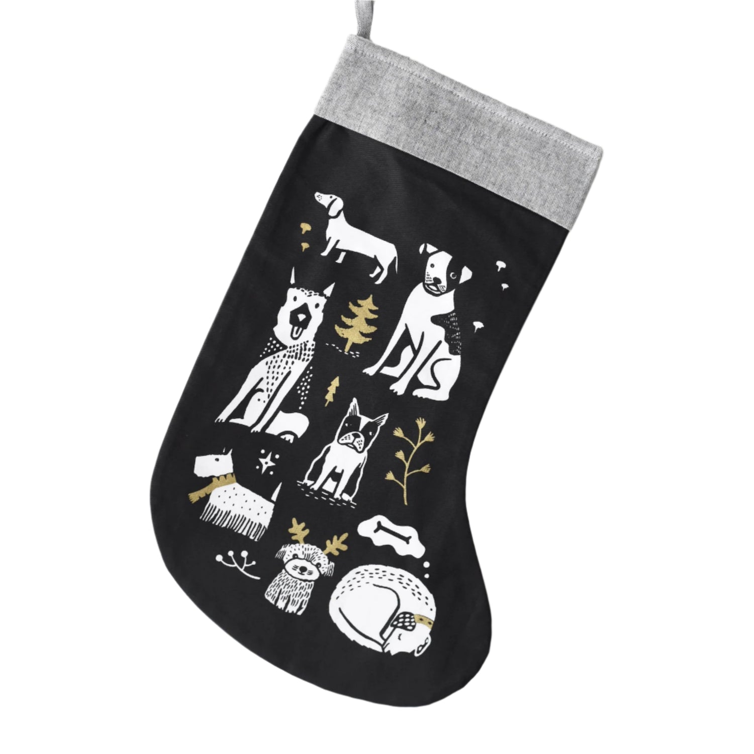 This Christmas stocking will give a touch of Wee Gallery to your family holiday season. Festive Pups is printed in white on black 100% organic cotton twill with gold highlights. The inner layer of the stocking is printed with golden dots. Grey band at the top with sturdy loop for hanging. Made in India using ethical manufacturing practices.