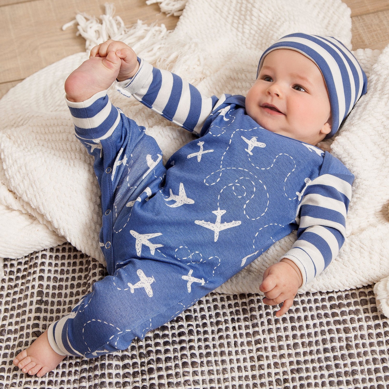 Your lil' flyer will have flying fun in this airplane romper! It's made of stretchy, comfy cotton rib with blue stripe trim and envelope neck, plus snaps at the bottom for speedy changing. (This doesn't include headgear, so you'll need to get that separately.)